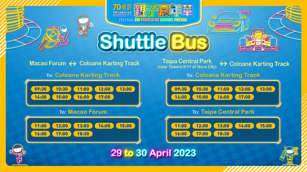 For the convenience of the general public, the organizer will arrange two shuttle bus routes, which will take residents and tourists to and back from the Coloane Karting Track, from the Macao Forum and Taipa Central Park (near Towers 9-11 of Nova City) respectively. The first shuttle bus is scheduled to depart at 9:30 am.