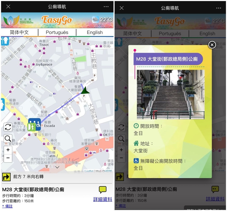 IAM is successively adding “EasyGo Public Toilet Navigation” QR codes to public toilet signage in the various districts of Macao. The public or tourists only need to use their mobile phones to scan the mentioned QR code for access to the “EasyGo Public Toilet Navigation” webpage. After they allow the device to obtain their location, they can use the navigation function to proceed to the nearest public toilet. Meanwhile, they can also obtain information such as the opening hours and detailed address of the public toilet and whether barrier-free facilities are available in the toilet. Users can save the picture of the QR code to use the function when needed. IAM will successively increase public toilet signage and QR codes to make it convenient for the public and tourists to obtain information about public toilets.