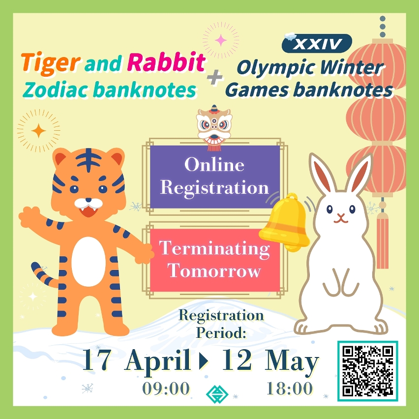 The online registration period for the exchange of the Tiger and Rabbit Zodiac banknotes and the XXIV Olympic Winter Games banknotes will end at 6:00pm tomorrow (May 12). The Monetary Authority of Macao would like to remind those citizens who are interested in exchanging for the said banknotes to complete the registration process before the mentioned deadline.