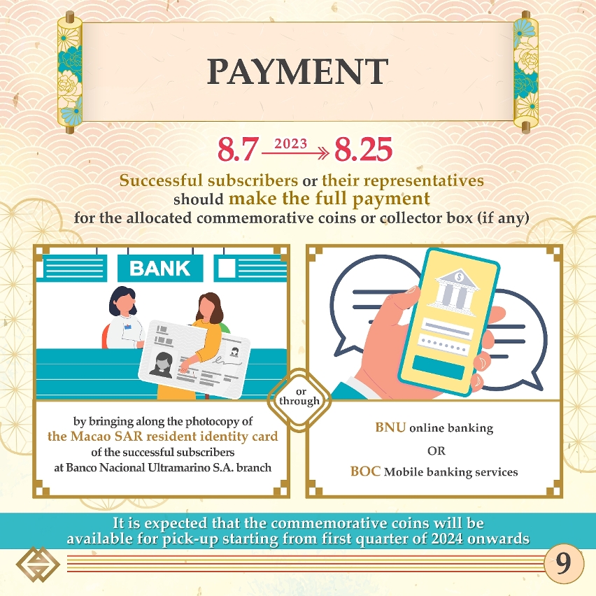 The online subscription period for the 2024 Year of the Dragon commemorative coins and Lunar Year Commemorative Coin Collector Box (2020-2031) will end at 6:00pm on 28 July 2023 (next Friday). Hence, AMCM would like to remind Macao residents who are interested in subscribing for the said coins and collector box to complete the online subscription process (https://registration.amcm.gov.mo/COCSCollection/terms_pt.html) before the mentioned deadline. A service counter has also been set up at the lobby of AMCM during the mentioned period to provide registration service for those who require assistance. For enquiries, please visit our webpage or call our hotline at 28565071 or 28565072.