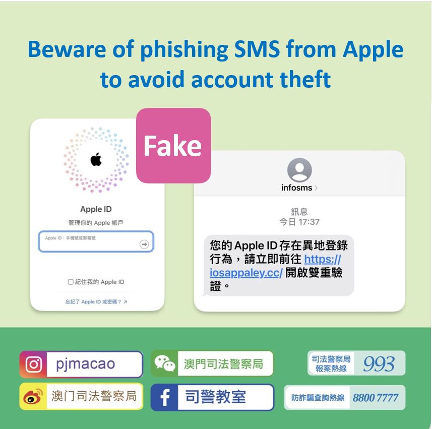 The Judiciary Police (PJ) has uncovered phishing SMS messages with unidentified links from scammers impersonating Apple Inc. These fake messages claim that the recipients' Apple accounts have logged in from another location, and they have to click the embedded links to proceed with two-way verification.