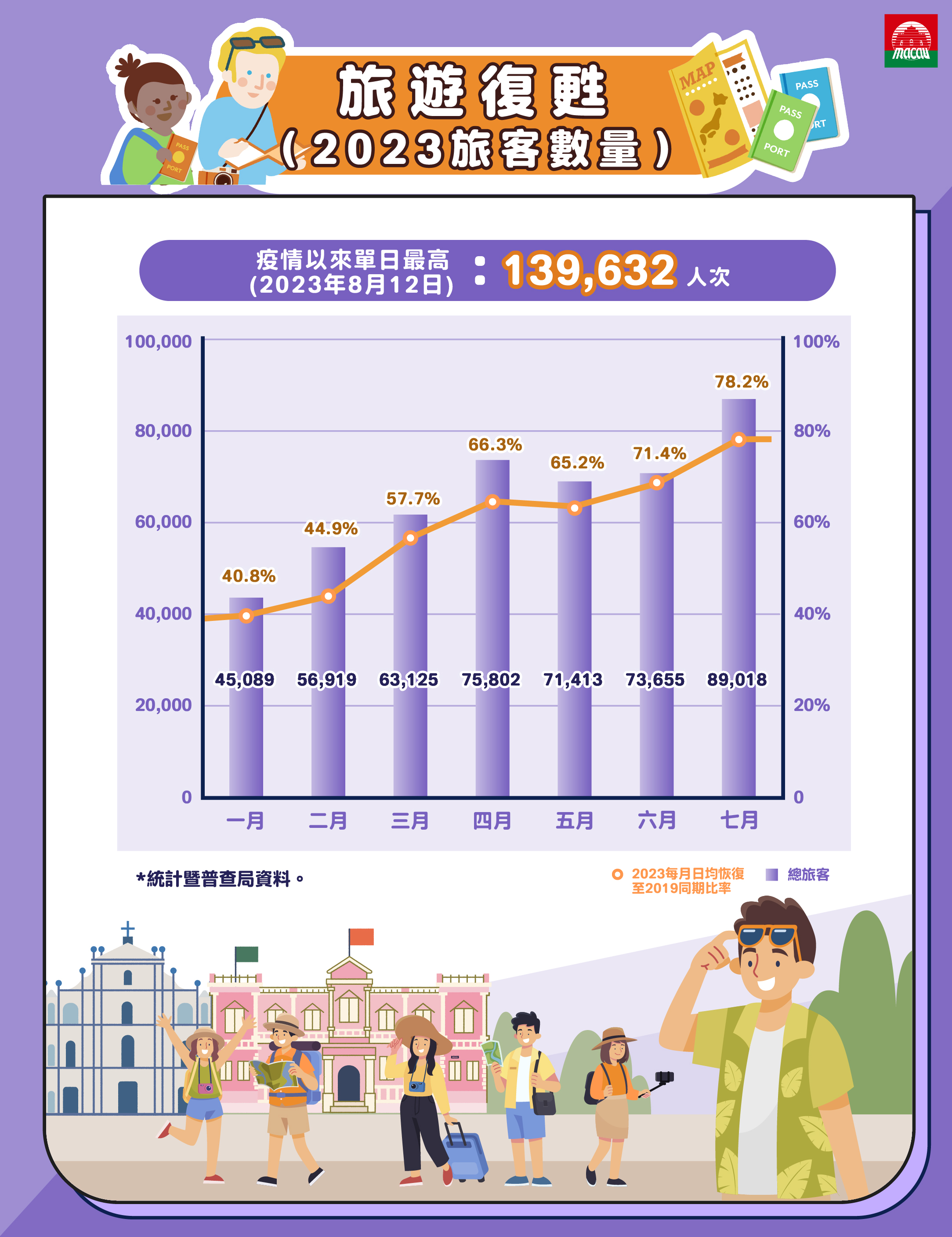 In terms of visitor arrivals to Macao, the Statistics and Census Service recently announced that a total of 14.40 million inbound visitors were recorded from January to July this year. The situation of tourists visiting Macao in July was satisfactory. The average daily number of inbound tourists recovered to 78.2% of the same period in 2019 before the pandemic. Among them, the average daily number of Mainland tourists in July recovered to 74.3% of the same period in 2019. During the peak summer season, the number of tourists visiting Macao has further increased. According to provisional data, a total of 139 thousand people arrived on August 12, the highest single-day visitor arrivals this year and the highest in three and a half years.