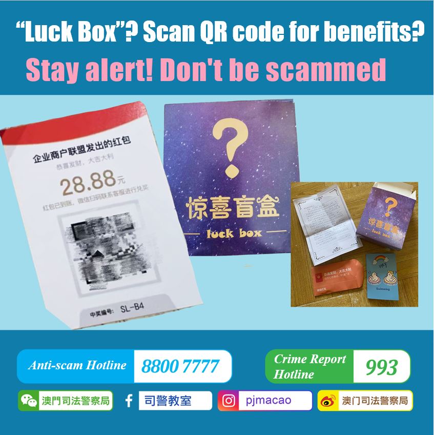The Judiciary Police (PJ) noticed that in neighboring regions, fraudsters impersonated online customer service representatives and used courier services to send out "luck boxes" randomly. After unboxing, the victim would find a card with the message "scan QR code to obtain red packets" and a QR code. Upon scanning the code, the victim would be transferred to a phishing website or a “brushing” scam group and be defrauded.