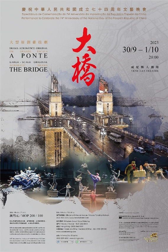 The “Performance to Celebrate the 74th Anniversary of the National Day of the People's Republic of China” – Large-scale original acrobatic drama “The Bridge”, jointly organised by the Cultural Affairs Bureau of the Macao SAR Government and the Department of Publicity and Culture of the Liaison Office of the Central People’s Government in the Macao SAR, and presented by China Nanjing Acrobatic Troupe Co., Ltd, will be held on 30 September and 1 October, at 8pm, at the Venetian Theatre, allowing the public to enjoy a magnificent acrobatic show while celebrating the National Day. Tickets are now on sale.