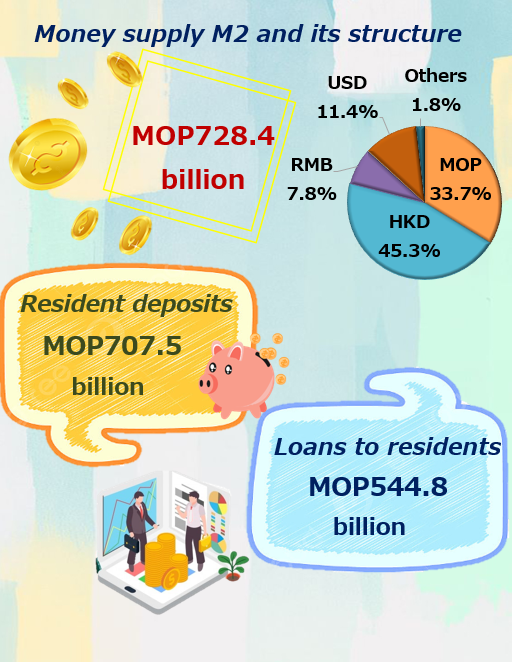 Currency in circulation decreased 0.3% whereas demand deposits rose 2.7%. M1 thus increased 1.8% from one month earlier. On the other hand, quasi-monetary liabilities dropped 0.2%. The sum of these two items, i.e. M2, amounted to MOP728.4 billion, which remained stable from a month ago. On an annual basis, M1 and M2 rose 4.2% and 6.7% respectively. The shares of pataca (MOP), Hong Kong dollar (HKD), renminbi (RMB) and United States dollar (USD) in M2 were 33.7%, 45.3%, 7.8% and 11.4% respectively.