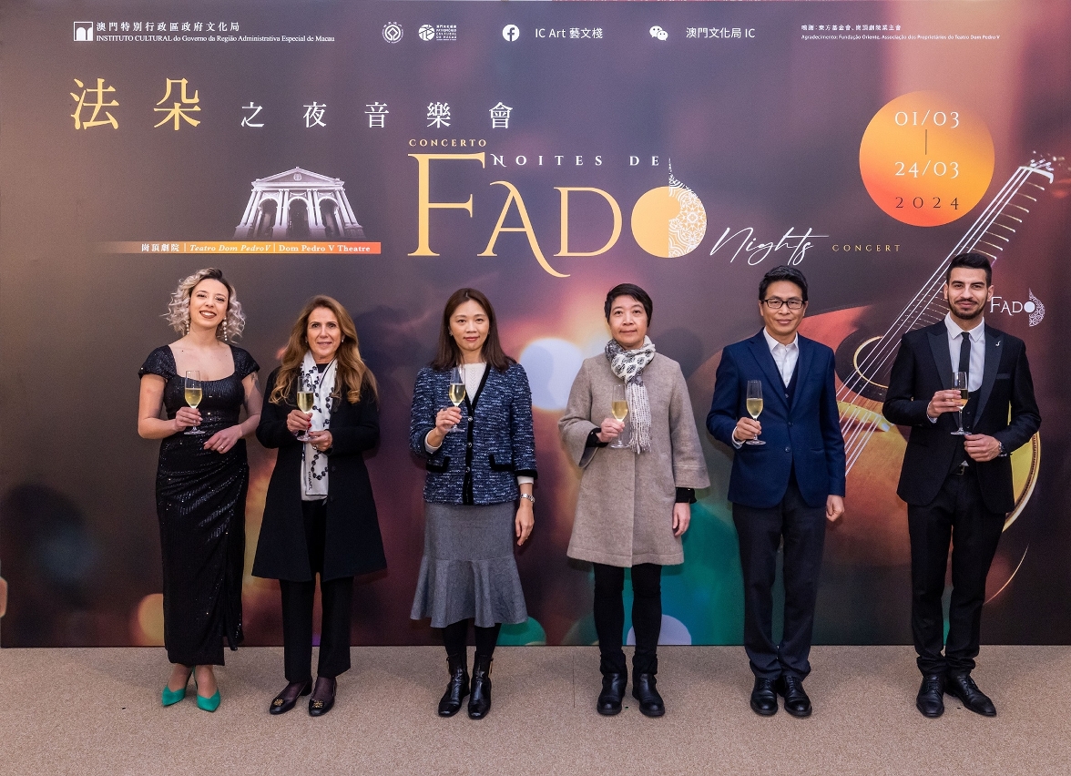 Organised by the Cultural Affairs Bureau (IC, from the Portuguese acronym), the first “Fado Nights” concert was held in the evening of 1 March at the Dom Pedro V Theatre in a lively atmosphere. The President of the Cultural Affairs Bureau, Leong Wai Man; the Advisor of the Office of the Secretary for Social Affairs and Culture, Lo Hou Chi; the Acting Director of the Macao Government Tourism Office, Cheng Wai Tong; the Head of Delegation of the Orient Foundation in Macao, Catarina Cottinelli da Costa; and Fado singers Tiago Correia and Bárbara Santos unveiled the event with a toasting ceremony before the performance.