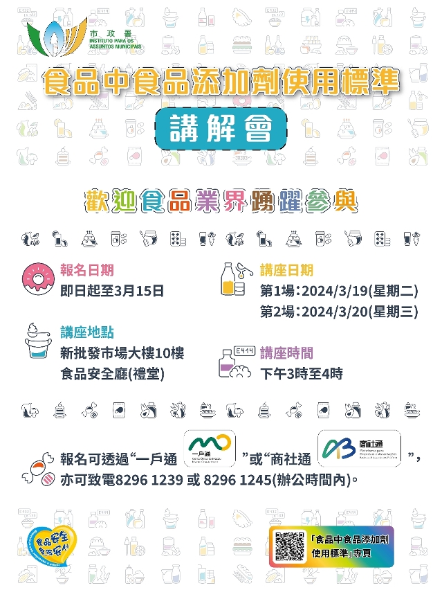 Entering into force on 1 May this year, the “Standard for Uses of Food Additives in Foodstuffs” integrates and updates relevant food safety standards, expanding the coverage to about 400 types of food additives and adding thousands of combinations of food additives and the standards for their corresponding maximum limits of use. To help the food sector further understand the details of the regulation and the points to note about the use of food additives, the Municipal Affairs Bureau (IAM) will hold two briefings, respectively on 19 and 20 March, on the “Standard for Uses of Food Additives in Foodstuffs”, with the aim of helping local food sector enhance production technologies as well as product safety and quality. Members of the sector are welcome to attend the briefings.