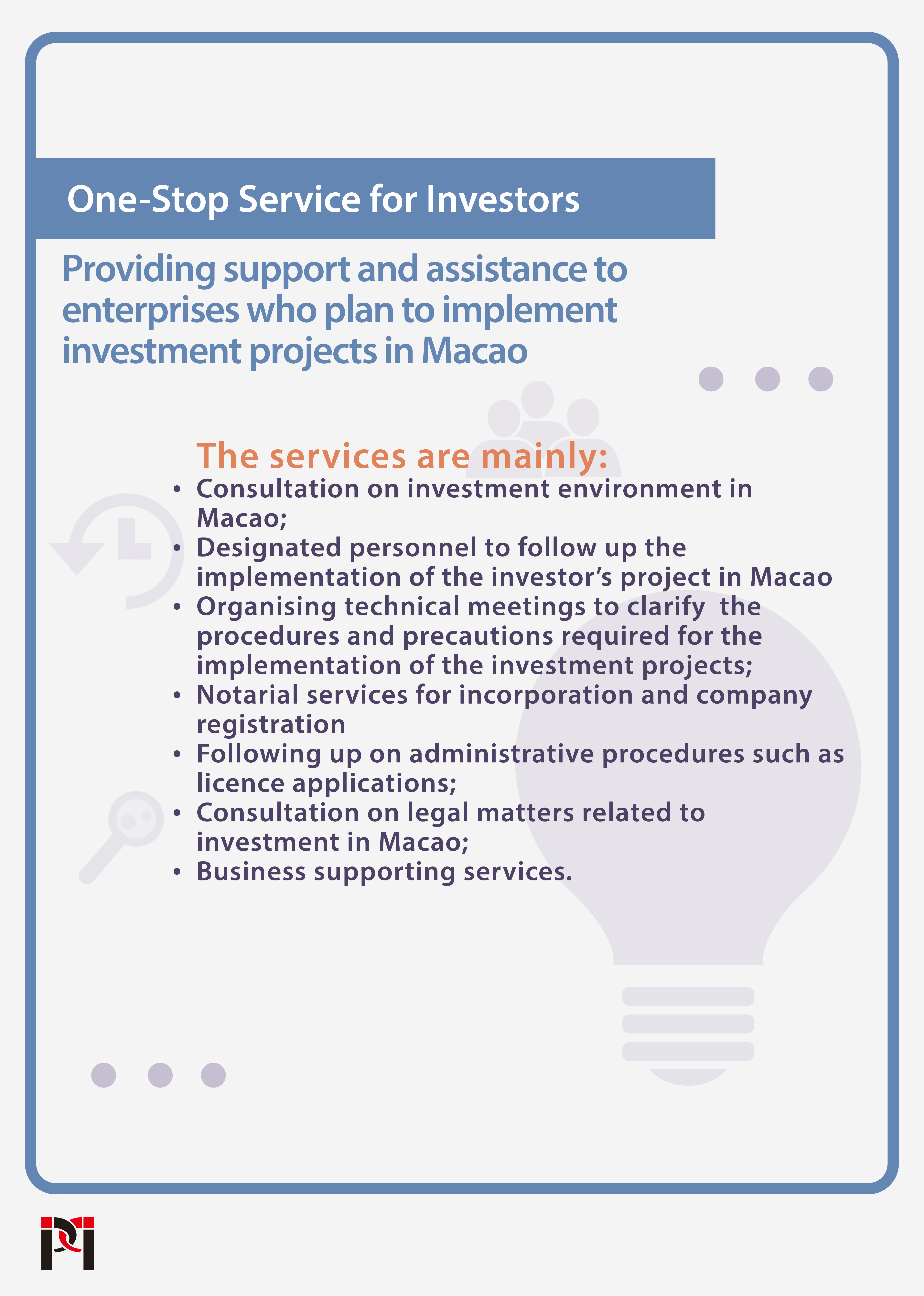 IPIM provides the Investor’s “One-stop Service” to assist domestic and foreign investors to implement their projects in Macao. The “one-stop” services for the entire investment process before, during and after the implementation mainly include consultation on investment environment in Macao, and organising prior technical meetings before project implementation; assigning designated personnel to follow up the investment projects, and assisting investors with administrative procedures such as incorporation and company registration, and licence applications during the implementation; and regular follow-up on project implementation, pro-actively providing investors with appropriate assistance, including secondary investment intentions and business matching needs after the business operation has started in the city.