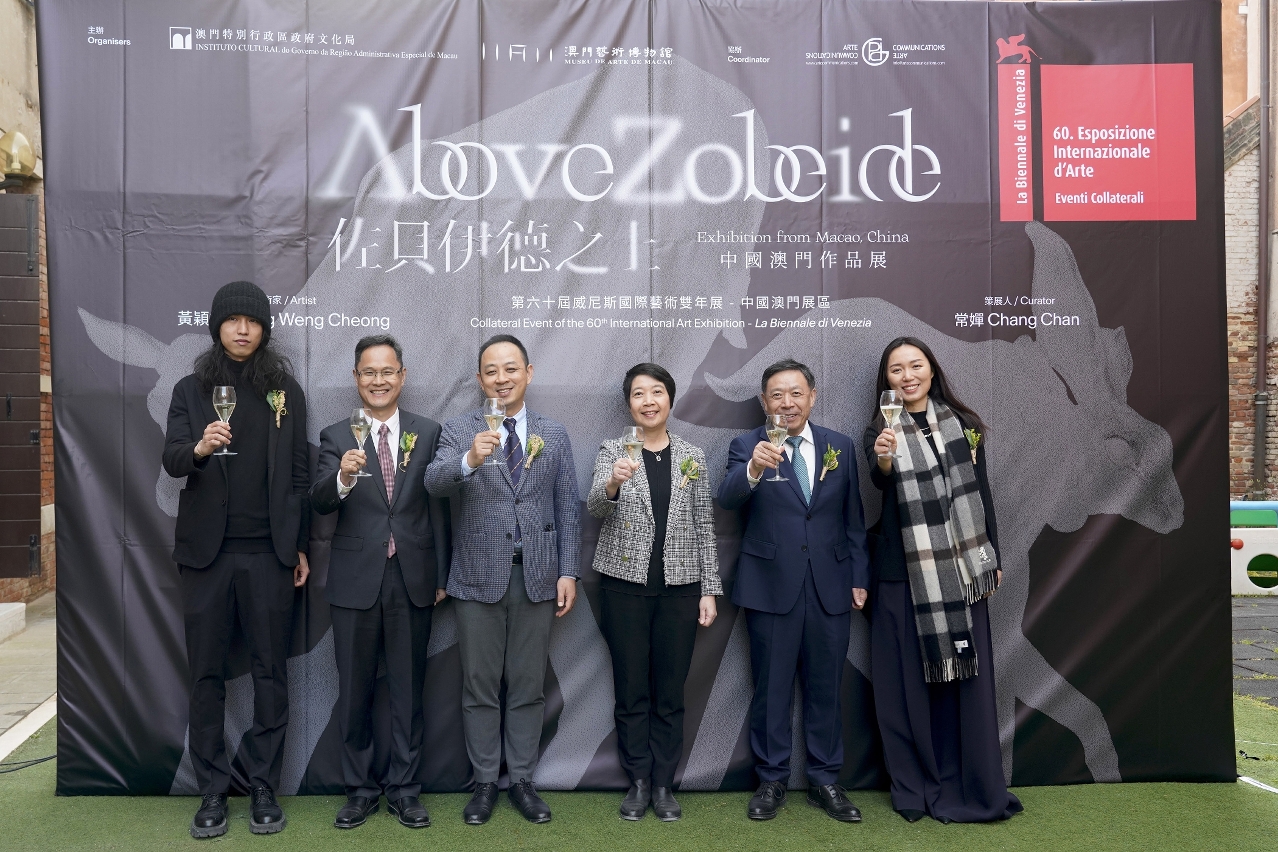The opening ceremony of the exhibition was officiated by the President of the Cultural Affairs Bureau of the Macao SAR Government, Leong Wai Man; the Counsellor of the Embassy of the People’s Republic of China in the Republic of Italy, Zhang Lingxiao; the representative of China Pavilion at the 60th International Art Exhibition – La Biennale di Venezia and Member of the Board of the Bauhinia Culture Group Co., Ltd., Hu Xianzheng; the Chairman of the Board of the China Arts and Entertainment Group Ltd., Li Jinsheng; the artist Wong Weng Cheong and the curator Chang Chan. The event was attended by the Advisor of the Office of the Secretary for Social Affairs and Culture of the Macao SAR Government, Lo Hou Chi; the members of the Hong Kong Arts Development Council, Karen Chan Ka-yin, Alex Fan Hoi-kit, Kevin Lam Sze-cay, Heidi Lee Yik-shuen, Eva Man Kit-wah, Chloe Suen Yin-wah, Tam Kwok-kan, Tung Siu-hung and Zhao Zhi-jun; the Chief Executive of the Hong Kong Arts Development Council, Winsome Chow; the Deputy Director of the Leisure and Cultural Services Department of the Hong Kong SAR Government, Eve Tam Mei-yee; the Director of the Hong Kong Museum of Art, Maria Mok Kar-wing; and the Director of the Macao Museum of Art, Un Sio San, among others.