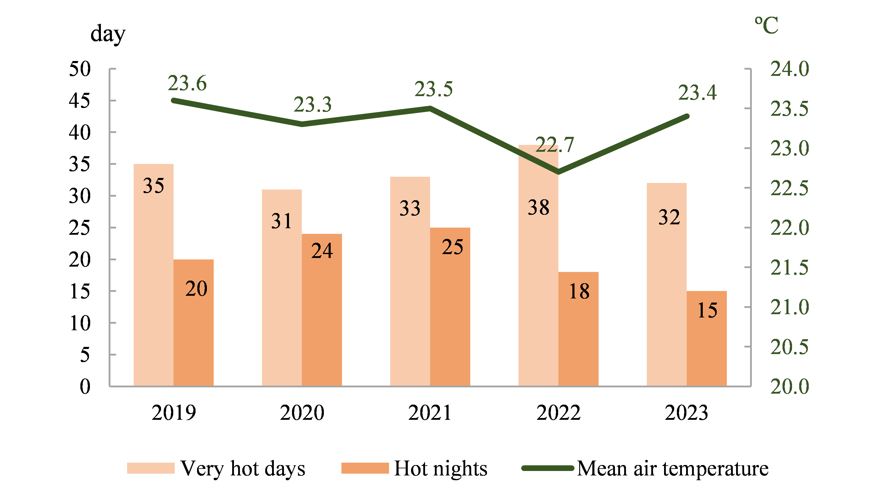 Information from the Statistics and Census Service (DSEC) indicated that the mean air temperature in Macao in 2023 was 23.4 ºC, which was 0.6 ºC above the climatological normal (1991-2020). The highest monthly temperature of 35.2 ºC was recorded in October, breaking the record for the month. Numbers of very hot days (with maximum temperature at or above 33 ºC) and hot nights (with minimum temperature at or above 28 ºC) were 32 and 15 respectively, up by 0.7 day and 3.5 nights compared with the climatological normal (1991-2020). Meanwhile, number of cold days (with minimum temperature at or below 12 ºC) decreased by 13.1 to 26 days.