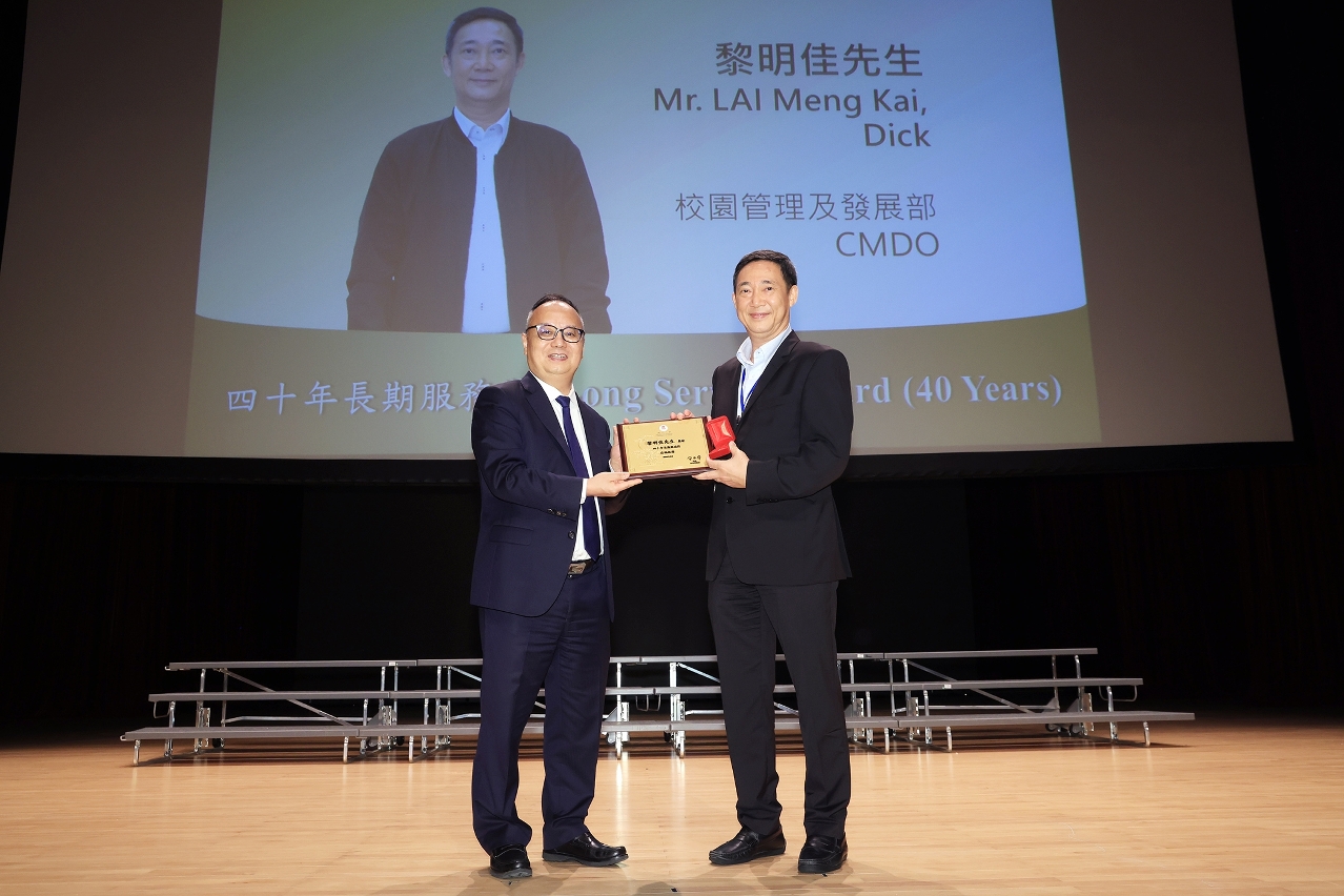 Wong Man Chung, interim college master of Cheong Kun Lun College, head of the Department of Electrical and Computer Engineering of the Faculty of Science and Technology, and professor in the State Key Laboratory of Internet of Things for Smart City, was presented with the Long Service Award for his 30 years of service at the university. He expressed gratitude to his colleagues and supervisors for their support and the opportunities given to him over the years. He added, ‘UM is now ranked among the top 200 universities in the world, which is a testament to the hard work of the UM members. I will continue to educate the new generation with the concept of holistic education and strive for more outstanding research.’