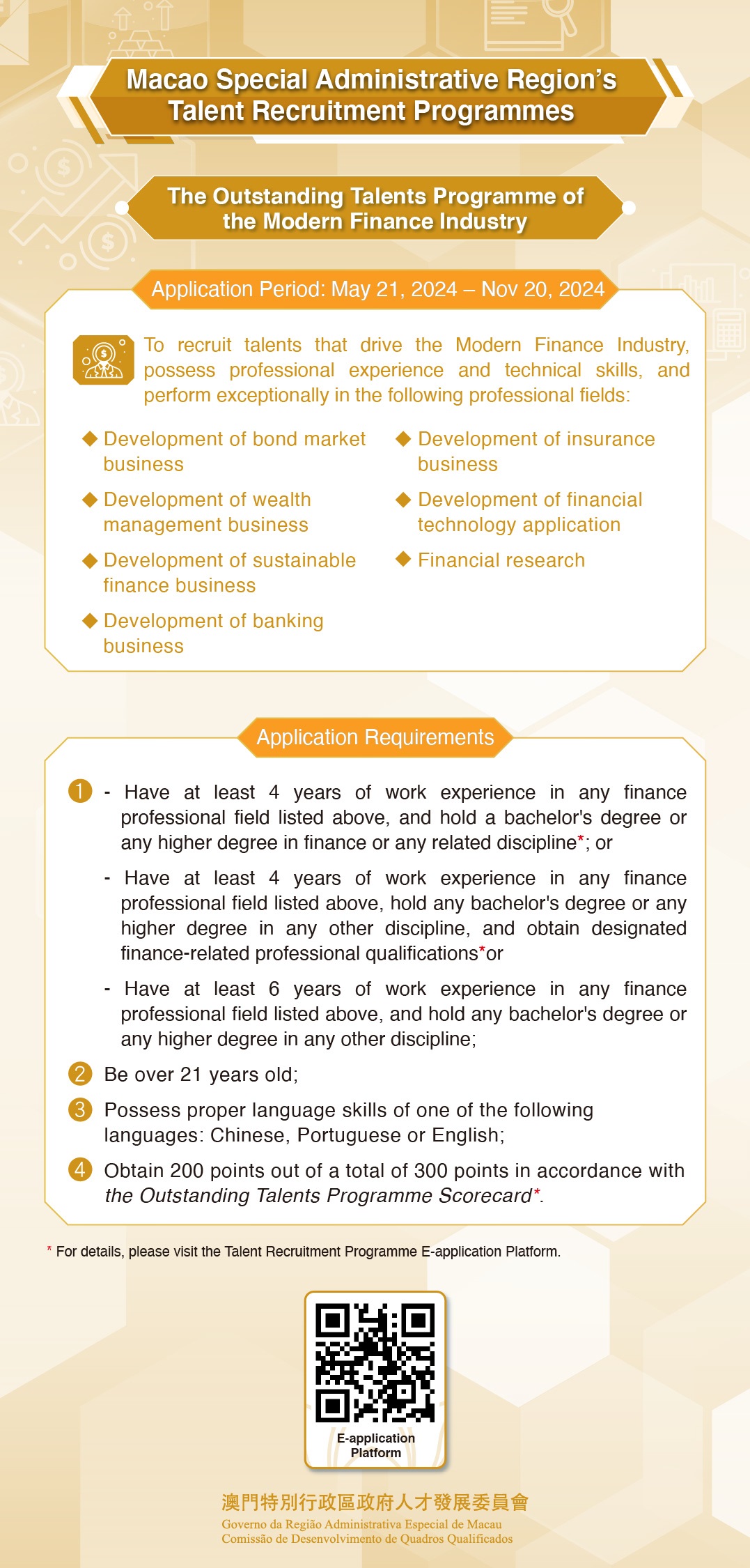 To facilitate the "1+4" strategy for the development of adequate economic diversification as well as further support local industries and sustainable social development, the Government of the Macao Special Administrative Region (SAR) launches its new round of talent recruitment programmes from May 21 to November 20, 2024. The 9 programmes include the High-end Talents Programme, the Outstanding Talents Programmes and the Advanced Professionals Programmes for the Big Health Industry, the High-Tech Industry, the Modern Finance Industry, as well as the Culture, Sports and Others Industries.