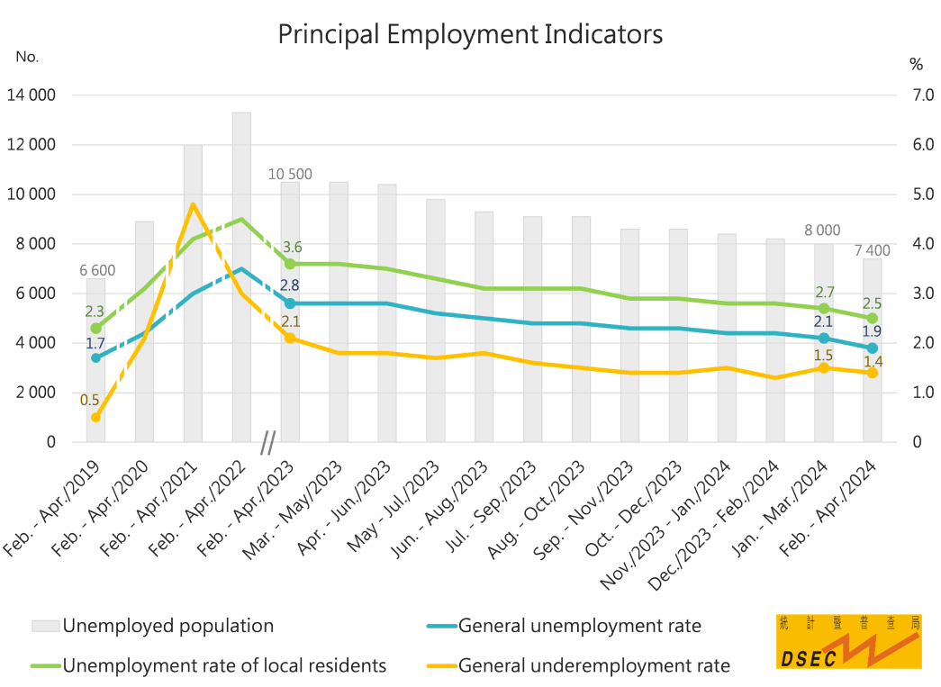 Information from the Statistics and Census Service (DSEC) indicated that both the general unemployment rate (1.9%) and the unemployment rate of local residents (2.5%) for February - April 2024 decreased by 0.2 percentage points from the previous period (January - March 2024). Both measures returned to the corresponding levels of December 2019 - February 2020. Besides, the underemployment rate dropped by 0.1 percentage point to 1.4%. In comparison with February - April 2019, the three indicators rose by 0.2, 0.2 and 0.9 percentage points respectively.