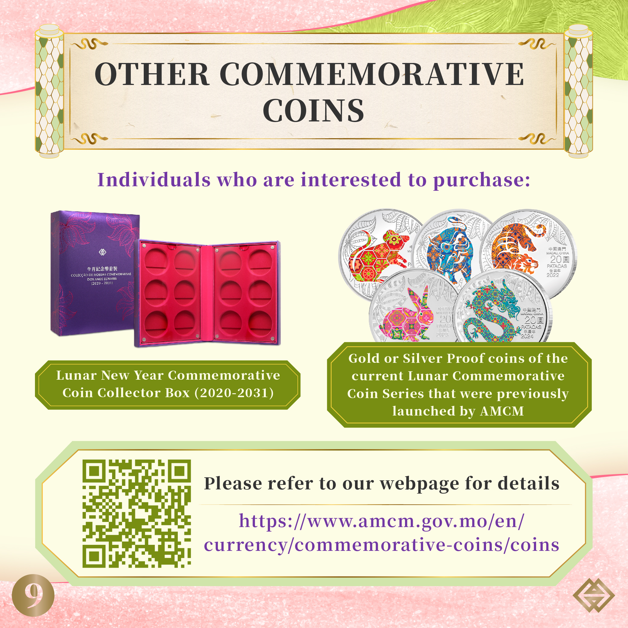Individuals who are interested to purchase Gold or Silver Proof coins of the current Lunar Commemorative Coin Series and Lunar New Year Commemorative Coin Collector Box (2020-2031) that were previously launched by AMCM, may refer to our webpage (https://www.amcm.gov.mo/en/currency/commemorative-coins/coins) for details.