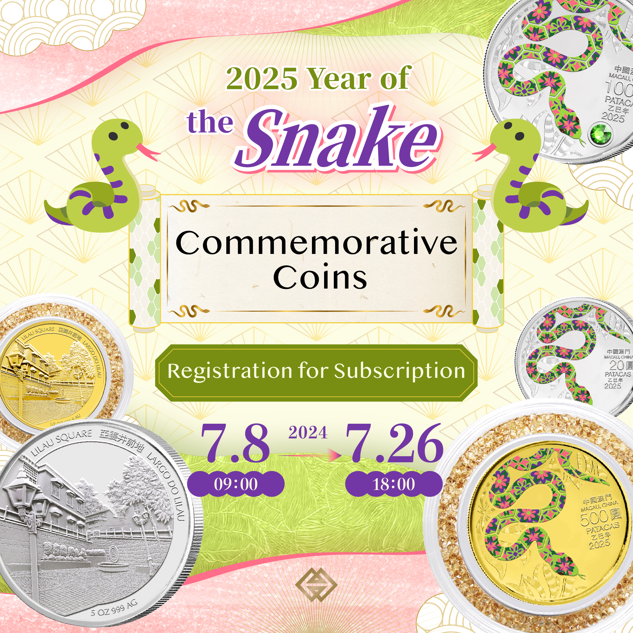 The Monetary Authority of Macao (AMCM) will be launching 2025 Year of the Snake commemorative coins and online registration for the subscription will start on next Monday (8 July 2024).