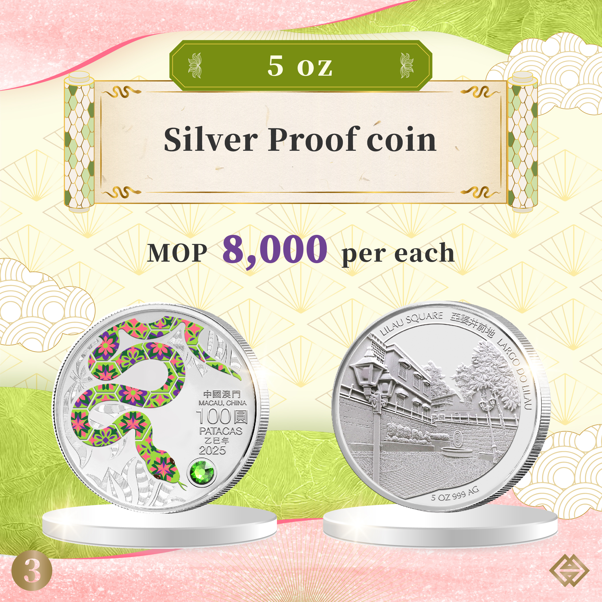 The obverse design of 2025 Year of the Snake commemorative coins features the outline of the Chinese Zodiac sign, portrayed with a vibrant display of the distinctive Portuguese-inspired patterned tiles. The reverse design features the World Heritage Site of Macao, Lilau Square, in a bottom-up perspective presentation, sculpted in the latest angular high relief minting technique. The Year of the Snake commemorative coins comprise a 1 oz and a 5 oz Silver Proof coin as well as a 0.5 oz Gold Proof coin. The selling price of the coins is MOP1,380, MOP8,000 and MOP16,500 respectively.