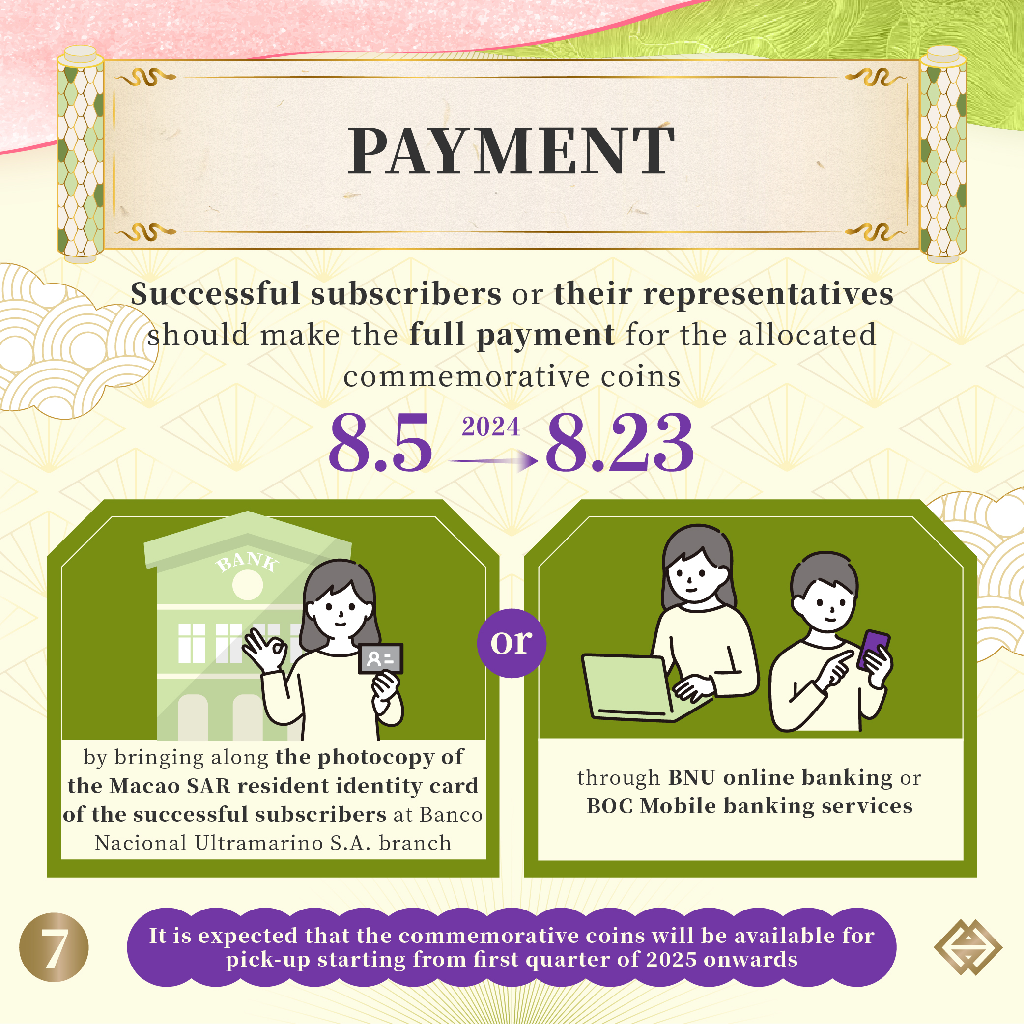 Successful subscribers or their representatives should make the full payment for the allocated commemorative coins between 5 August and 23 August 2024, by bringing along the photocopy of the Macao SAR resident identity card of the successful subscribers at Banco Nacional Ultramarino S.A. branch, or through BNU online banking or BOC Mobile banking services. It is expected that the commemorative coins will be available for pick-up starting from first quarter of 2025 onwards. For further details relating to the online registration and subscription procedures, please refer to our webpage or call 28565071 / 28565072.