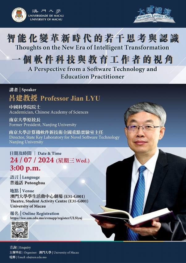 As part of the University Lecture Series, the University of Macau (UM) will hold a talk titled ‘Thoughts on the New Era of Intelligent Transformation: A Perspective from a Software Technology and Education Practitioner’ on 24 July (Wednesday). Lyu Jian, academician of the Chinese Academy of Sciences (CAS), former president of Nanjing University and director of the State Key Laboratory for Novel Software Technology at Nanjing University, will be the speaker. All are welcome to attend.