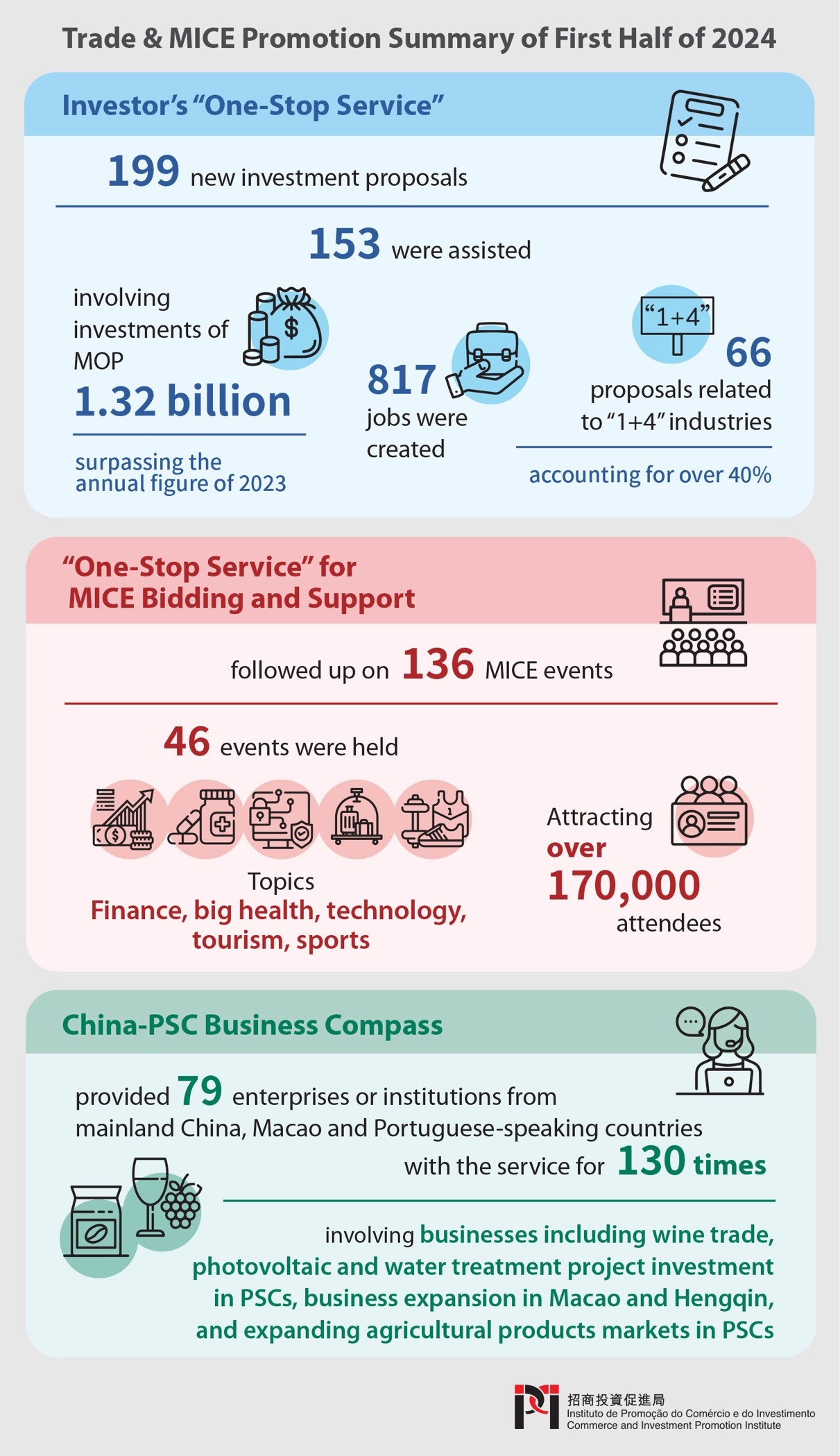 In the first half of 2024, the Investor’s “One-stop Service” provided by the Macao Trade and Investment Promotion Institute (renamed as Commerce and Investment Promotion Institute on 1 July) received 199 new investment proposals, of which 153 were assisted. According to the investors, the assisted proposals created 817 jobs and involved investments amounting to MOP 1.32 billion, reflecting investors’ confidence in Macao’s business environment and development prospects. The amount of investment in the first half of 2024 has exceeded the annual figure of 2023. Among the assisted investment proposals, 66 proposals were related to the “1+4” industries, accounting for more than 40%, providing new impetus for the development of key emerging industries in Macao.