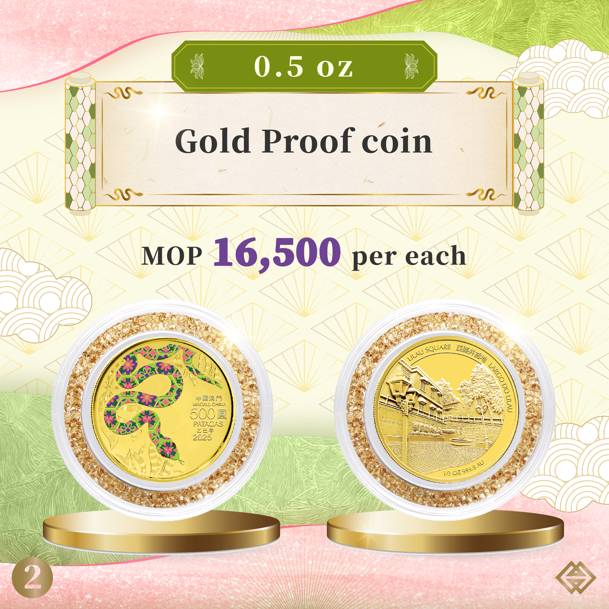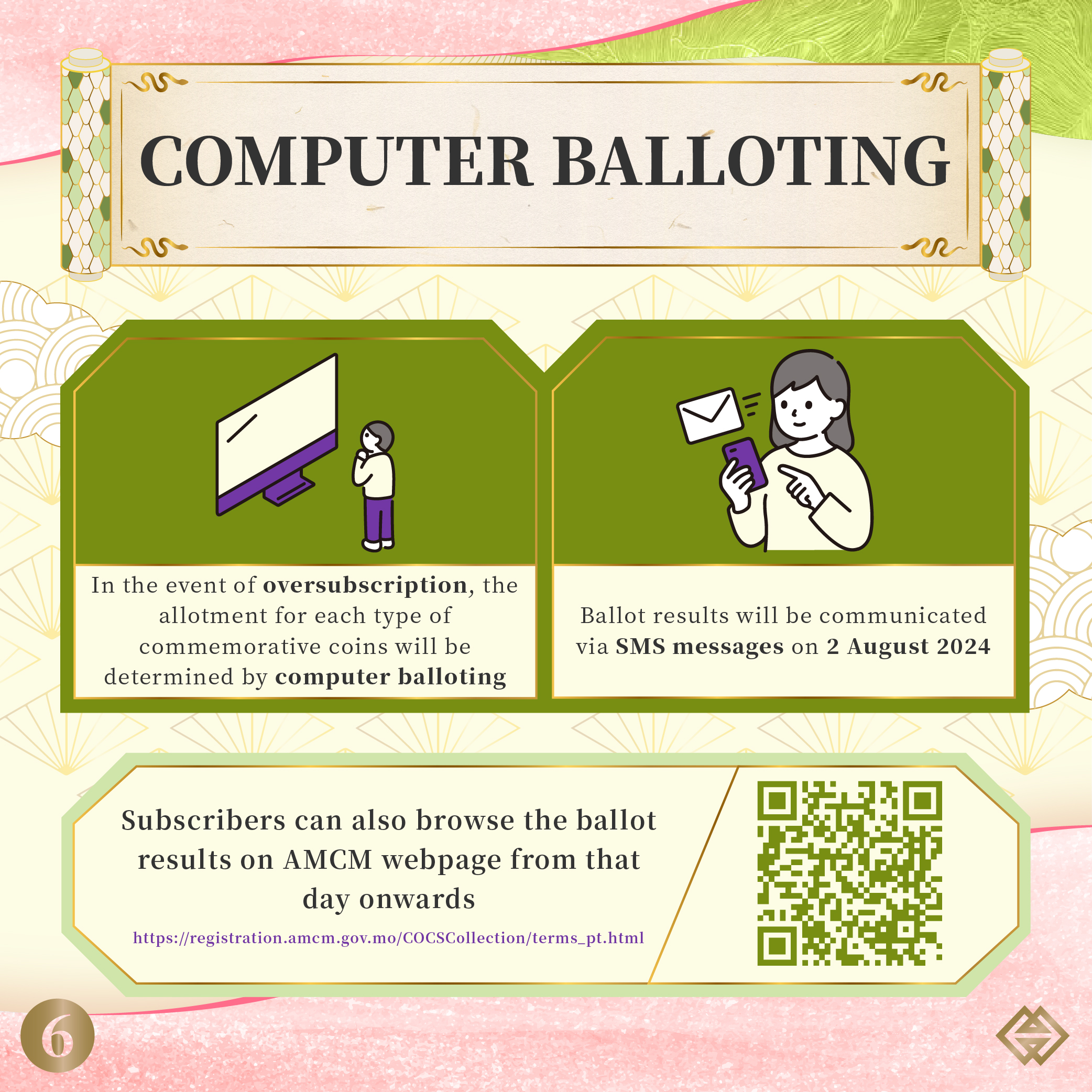 The Snake commemorative coins comprise a 1 oz Silver Proof Coin, a 5 oz Silver Proof Coin and a 0.5 oz Gold Proof Coin. In the event of oversubscription, the allotment for each type of commemorative coins will be determined by computer balloting. The ballot results will be communicated via SMS messages on 2 August 2024. Subscribers can also browse the ballot results on the webpage of AMCM from that day onwards (https://registration.amcm.gov.mo/COCSCollection/terms_pt.html).