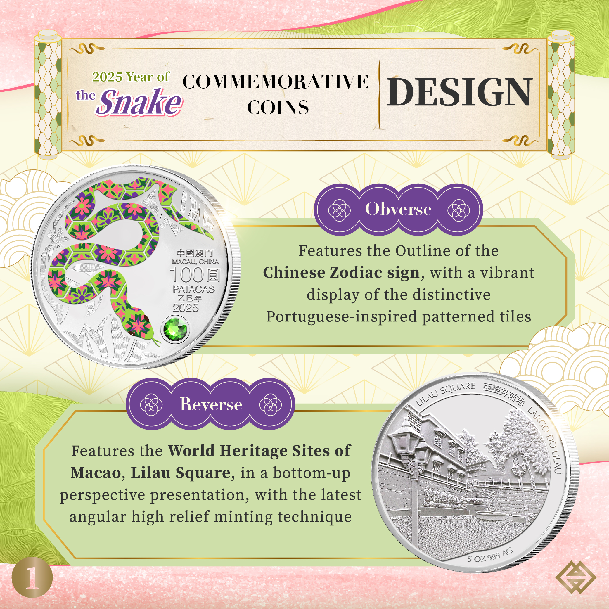 The Snake commemorative coins comprise a 1 oz Silver Proof Coin, a 5 oz Silver Proof Coin and a 0.5 oz Gold Proof Coin. In the event of oversubscription, the allotment for each type of commemorative coins will be determined by computer balloting. The ballot results will be communicated via SMS messages on 2 August 2024. Subscribers can also browse the ballot results on the webpage of AMCM from that day onwards (https://registration.amcm.gov.mo/COCSCollection/terms_pt.html).