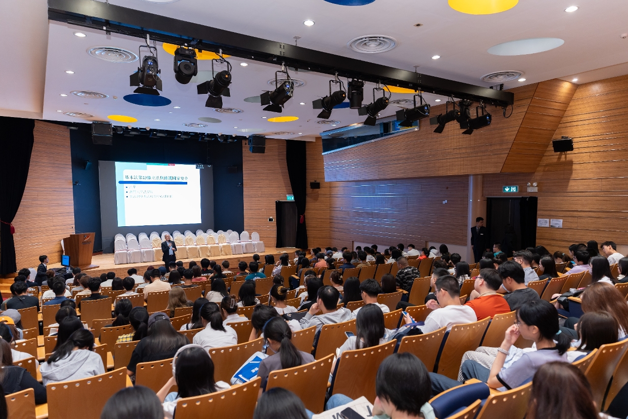 Additionally, to implement education on the spirit of “loving the motherland and Macao”, and to provide new students with a deeper understanding of national conditions, the University held its first national flag-raising ceremony of the new academic year on the same day, along with several seminars, among which the University invited Dr. Kong Wa, Associate Director of the Centre for Constitutional Law and Basic Law Studies at the Faculty of Law of the University of Macau, through the Macao Basic Law Promotion Association, to host a special seminar on “The Correlation between the National Constitution Law, the Basic Law and the National Security Law”. The University also invited the Judiciary Police to give a seminar on “Cybercrime and Fraud Prevention” to raise students’ awareness of and to protect them from cybercrime and fraud. Furthermore, the Public Security Police Force sent representatives to deliver a special seminar on “Road Traffic Safety and Special Authorisation to Stay” to enhance the understanding of local laws among non-local students.