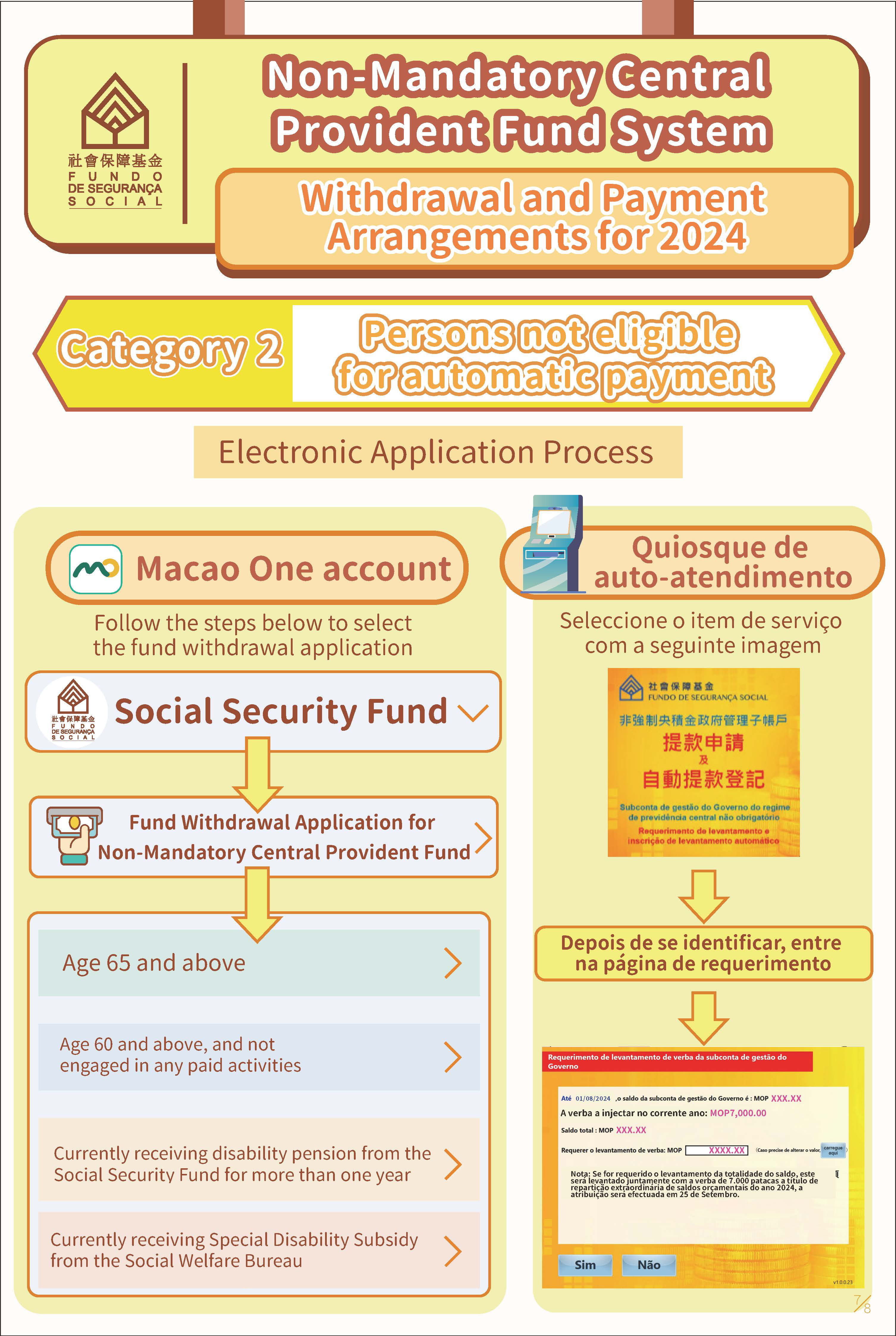 The 2024 Special Allocation from Budget Surplus for the Non-Mandatory Central Provident Fund System will be paid as early as 25 September. The Social Security Fund (abbreviated to FSS in Macao) announced the fund withdrawal arrangements in mid-June. There are about 95,000 people who are eligible for fund withdrawal this year, including about 71,000 senior citizens who registered last year or before for automatic withdrawal and met the eligibility requirements for automatic payment. There is no need for them to go through formalities, and the funds will be automatically deposited in the bank accounts where they are currently receiving old-age or disability pension. As for the 24,000 people who are not eligible for automatic payment, they need to apply for fund withdrawal on their own. To date, more than 16,000 people have not yet applied for fund withdrawal.