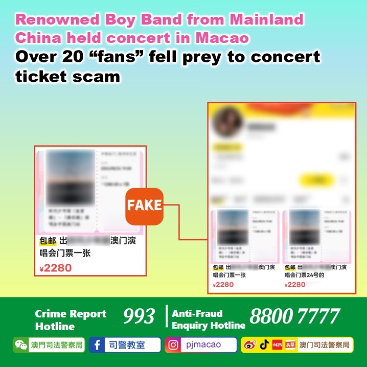 Many “fans” of a well-known boy band from Mainland China who held a concert in Macao earlier, had become victims of an online ticket scam. Since the 23rd of August, the Judiciary Police (PJ) has received at least 20 reports involving 24 victims, with a total loss exceeding 210,000 Macao Patacas.