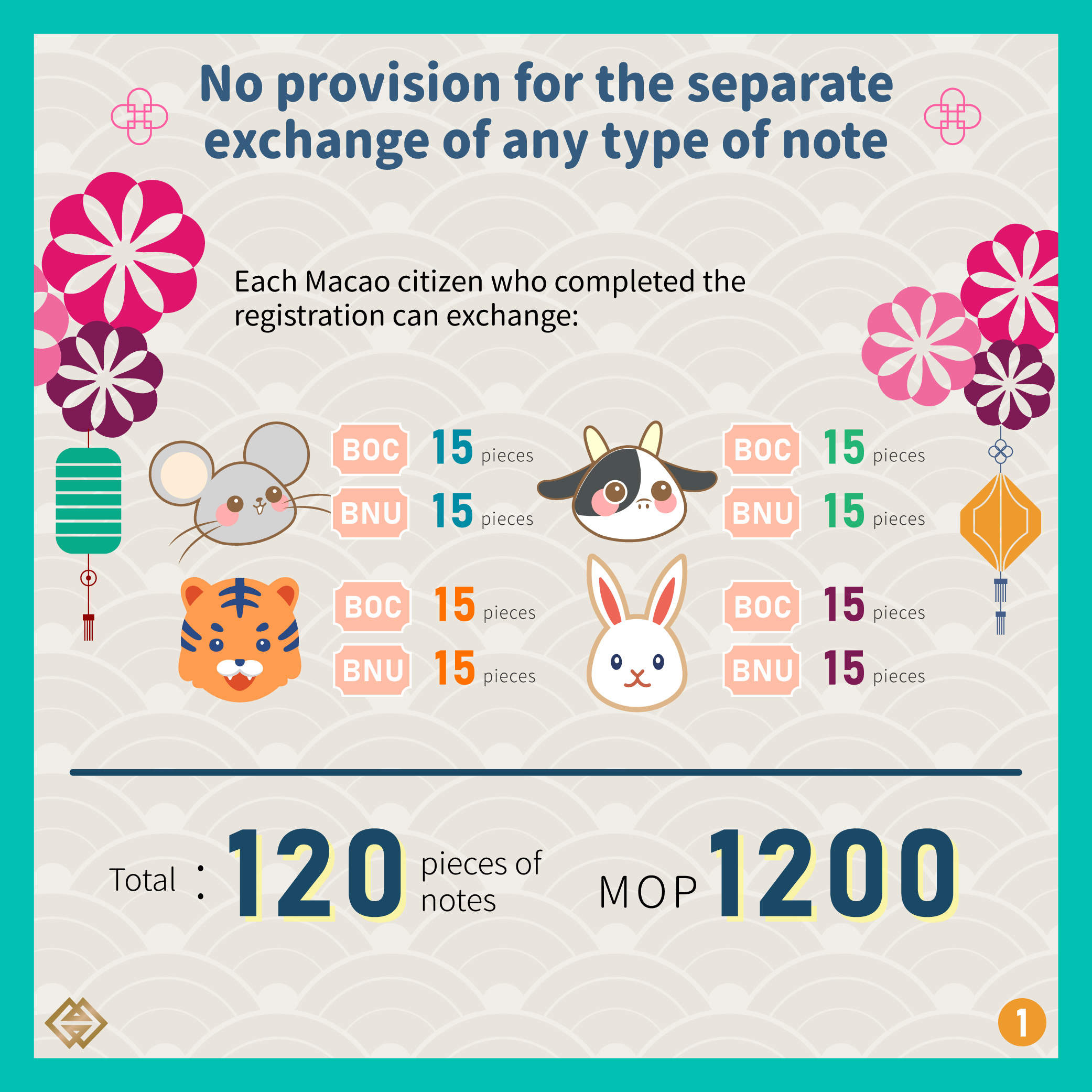 After consolidating the registration data, it is confirmed that each registered Macao resident can exchange for 15 pieces of the Rat, Ox, Tiger and Rabbit Zodiac banknotes of each Issuing Bank, totaling the exchange for 120 pieces of the mentioned banknotes with an exchange amount of MOP1,200. The exchange for four types of Zodiac banknotes from the two Issuing Banks is required to be conducted in one go, with no provision for separate exchange for any type of the notes.