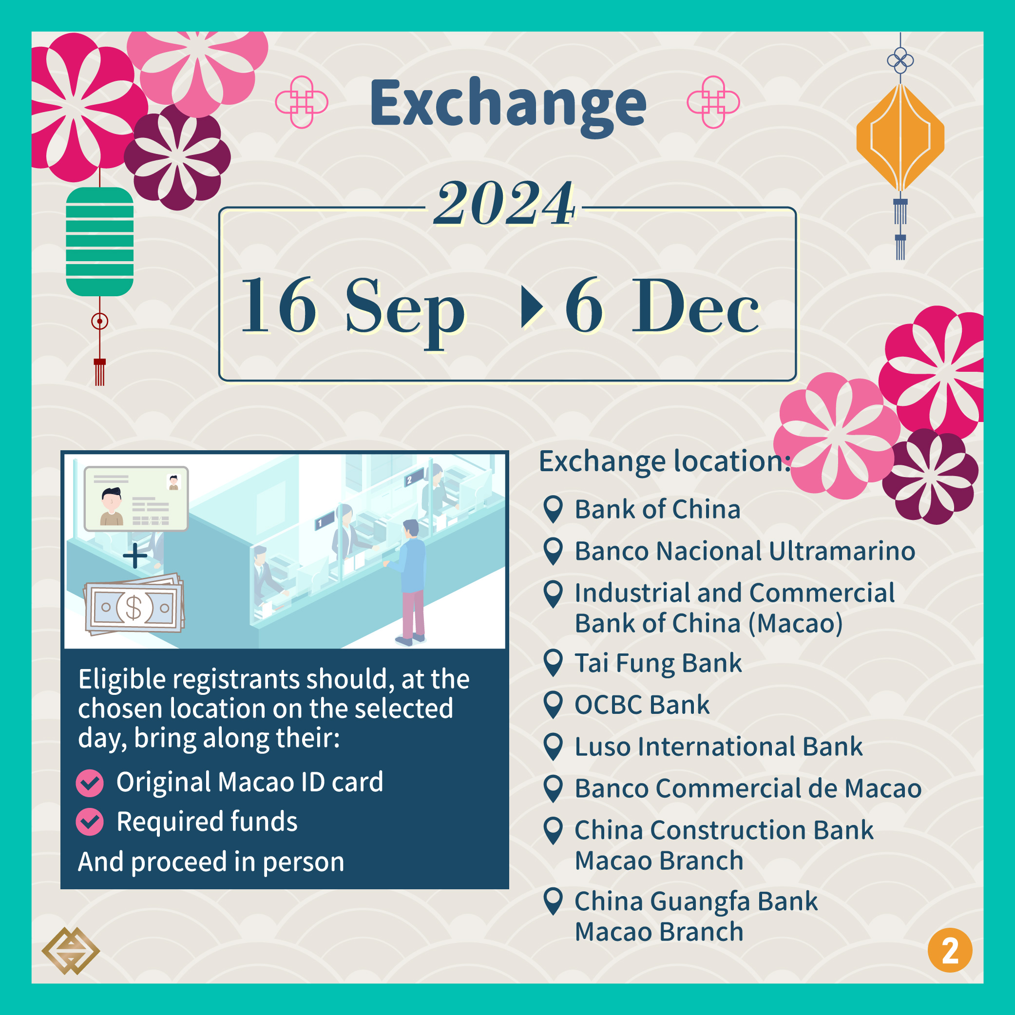 The exchange period is between 16 September 2024 and 6 December 2024. Registrants should bring along the required documents and funds, proceed in person or authorize representative to exchange at the chosen location on the selected day. For details, please visit our website (https://registration.amcm.gov.mo/banknotes/terms_pt.html). Should there be any queries, please call our hotline: 2856 5071 / 2856 5072 during business hours.