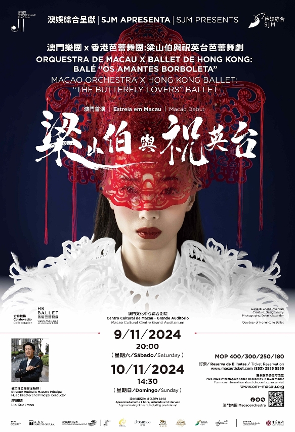 The Macao Orchestra 2024-25 Concert Season is co-organised by the Cultural Affairs Bureau, Macao Orchestra Company, Limited, Galaxy Entertainment Group, Melco Resorts & Entertainment, MGM, Sands China Ltd., SJM Resorts, S.A. and Wynn Resorts (Macau), S.A., and supported by BOC Macau. The Macao Orchestra x Hong Kong Ballet: “The Butterfly Lovers” Ballet is title-sponsored by SJM Resorts, S.A. and will last approximately two hours with an interval. Tickets are on sale at the Macau Ticketing Network at the prices of MOP400, MOP300, MOP250 and MOP180. The public can purchase tickets through the Macau Ticketing Network. 24-hour ticketing hotline: 2855 5555; online ticketing: www.macauticket.com.
