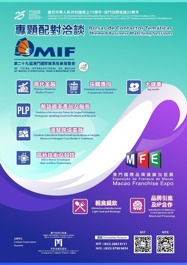 For those interested in participating in the abovementioned matching sessions or seeking the latest information, please visit the official website at www.mif.com.mo or www.mfe.mo; call (853) 2882 8711 (29th MIF) or (853) 8798 9654 (2024MFE); and follow “MICE_IPIM” on WeChat.