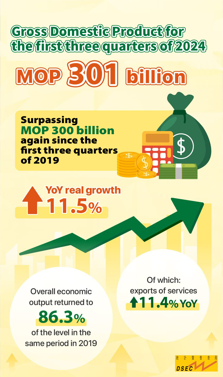 GDP increased by 11.5% year-on-year in real terms in the first three quarters of 2024, surpassing MOP300.0 billion again since the same period in 2019