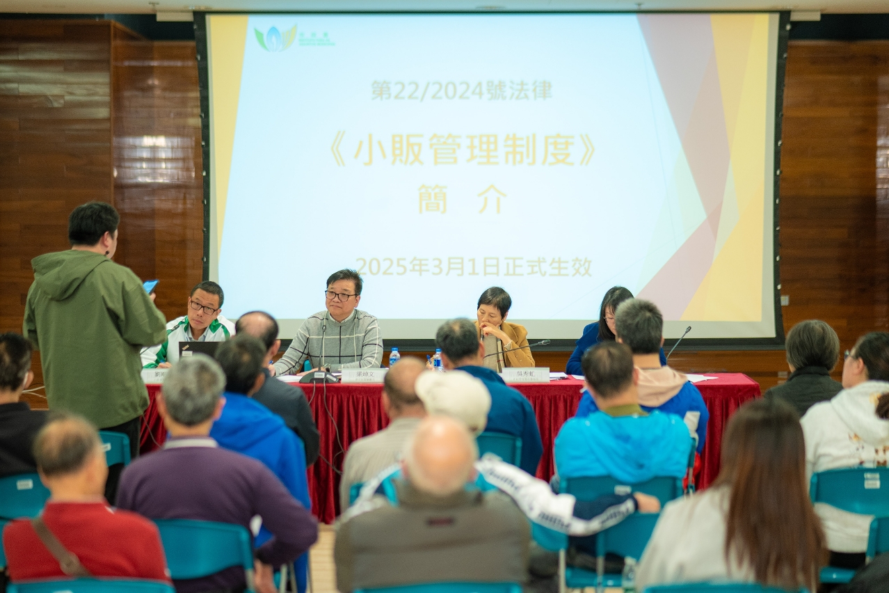 The “Hawker Management Regime” will officially enter into force on 1 March 2025. The Municipal Affairs Bureau (IAM) has commenced the promotion work of the new law. Three explanatory sessions on the law were held previously to introduce the content of the law and the transitional arrangements to the Consultative Committee on Municipal Affairs, the Community Service Consultative Committees of three districts and the representatives of the industry associations.