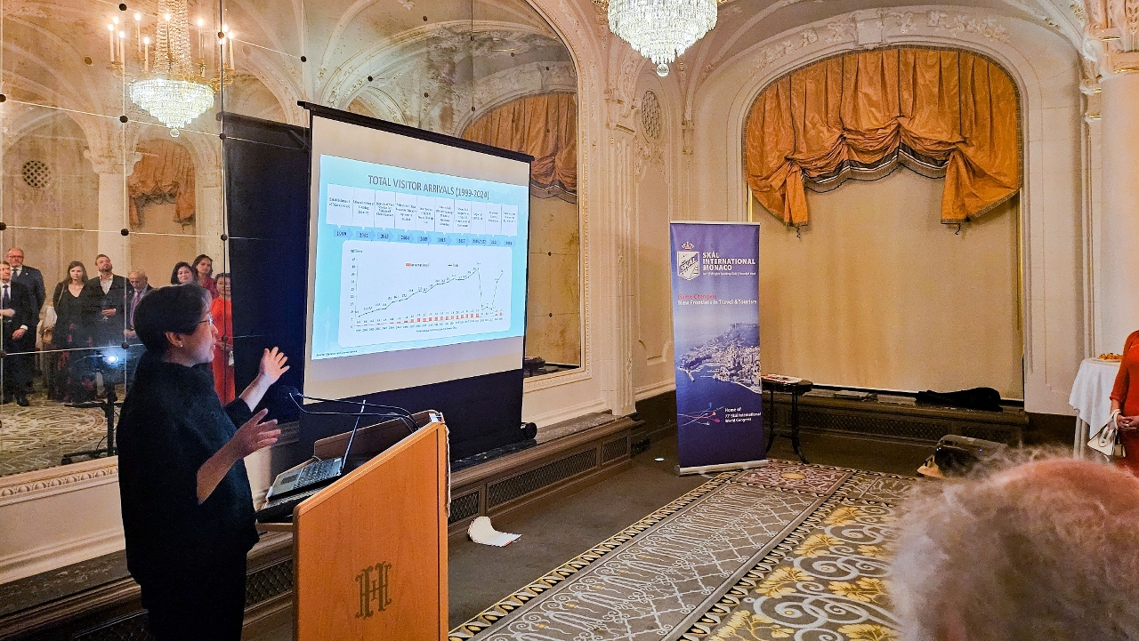 During the visit to Monaco from 8 to 9 March, the Macao SAR Government delegation was welcomed with a reception hosted by Skål International Monaco. The event brought together local leaders in tourism, finance, and technology to promote exchanges and explore cooperation opportunities. In his speech at the reception, Mr. Tai noted that this year marks the 30th anniversary of the establishment of diplomatic relations between China and Monaco, presenting a rare opportunity to develop cooperation between Macao and Monaco. He pointed out that Monaco and Macao are both renowned tourist destinations with similar historical, cultural, and tourism characteristics. Their advantageous geographical locations could facilitate the establishment of cooperative relationships between Monaco and Europe, and Macao and China, particularly the Guangdong-Hong Kong-Macao Greater Bay Area, in areas such as tourism, conventions, and events. Also at the reception, the Director of the Macao Government Tourism Office, Ms. Maria Helena de Senna Fernandes, introduced the latest development in Macao's tourism sector, showcasing the rich "Tourism+" elements.
