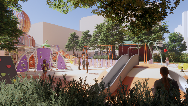Leisure Area in Bairro Social de Tamagnini Barbosa has an area of about 1,680 square metres. The leisure area is surrounded by several social welfare organisations and centres for the elderly. The venue will be reorganised to create a characteristic leisure area, with the installation of elevated play facilities and play equipment combinations in the shape of flowers to create a high-quality space for both parents and children. At the same time, to accommodate the needs of the elderly and individuals with special needs, the quantity and types of suitable fitness enhancement facilities have been increased, so as to enrich the inclusive experience. Facilities for shelter against the sun and rain have also been added to increase the comfort level of the leisure area.