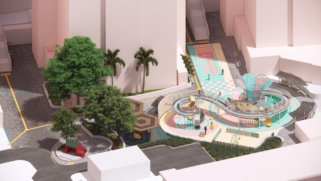 Leisure Area in Rua Central de T'oi Sán has an area of about 870 square metres. As there is a large number of schools nearby, it is heavily used by parents and schoolchildren. Elements of nature will be integrated into its design. The existing trees will be kept and together with the green landscape, a leisure experience in an urban oasis will be created. Surrounded by trees, customised children’s play equipment with the appearance of a tree house will be added. An elevated exploration pathway will also be installed to fully utilise the limited space of the venue and provide a fun experience for schoolchildren and youth to play and explore nature. Meanwhile, the layout of the leisure area will be reorganised, and recreational and leisure seating areas will be set up to optimise the passage and dynamic route in the district and improve the quality of the environment of the leisure area.