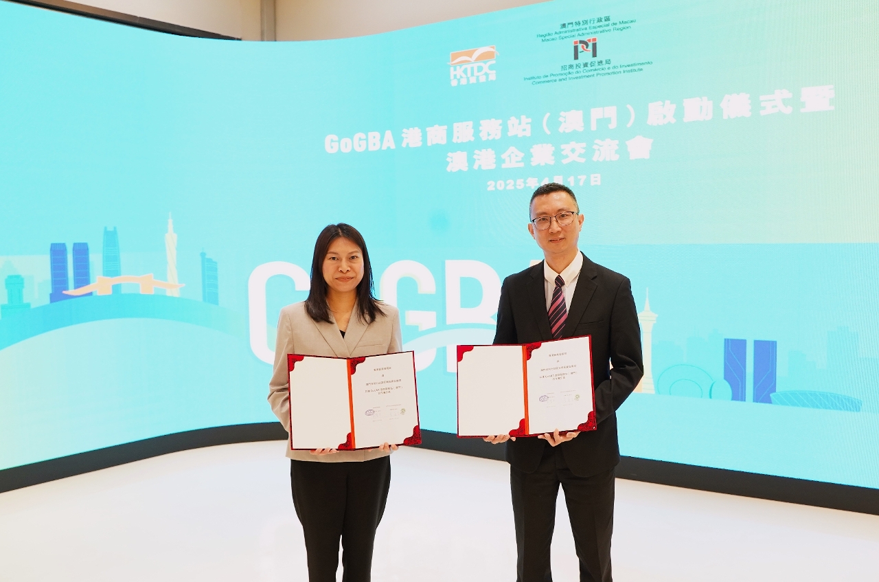 The GoGBA Hong Kong Service Station (Macao), jointly established by Macao Commerce and Investment Promotion Institute (IPIM) and Hong Kong Trade Development Council (HKTDC), hosted its inauguration and unveiling ceremony today (17th) at the China-PSCs Platform Complex in Macao. At the ceremony, representatives of both sides exchanged the “Memorandum of Cooperation on the Joint Construction of the GoGBA Hong Kong Service Station (Macao)”, aiming to provide enhanced support for Hong Kong businessmen seeking to venture into the Macao market. This initiative will further bolster the co-ordinated economic development within the Guangdong-Hong Kong-Macao Greater Bay Area.