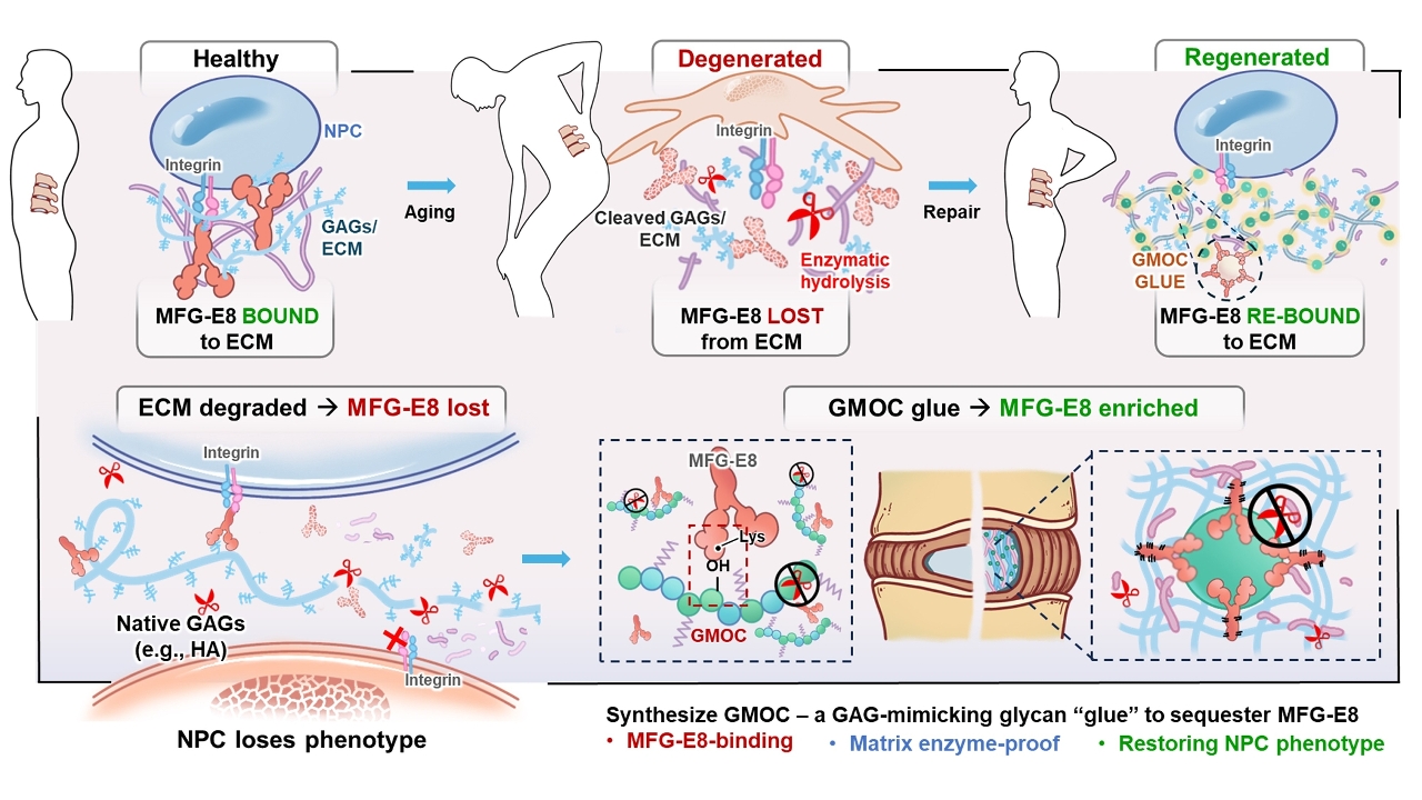 As people grow older, degeneration of the intervertebral discs can lead to common symptoms such as chronic lower back pain and reduced mobility in the lower limbs, significantly diminishing quality of life. However, current clinical treatments either only provide temporary pain relief or carry a risk of recurrence following surgery. Through the detailed analysis of clinical specimens and databases, the research team made a groundbreaking discovery: the progression of IDD is linked to the loss of a protein called MFG-E8, which is crucial for maintaining the health of nucleus pulposus cells. Further investigation revealed that this protein depletion is caused by an increase in glycosidases in the nucleus pulposus tissue of the disc. These enzymes act like scissors, cleaving the glycosaminoglycans (GAGs) that normally protect MFG-E8. Building on this finding, the team synthesised a glucomannan octanoate (GMOC), a compound with a structure similar to human GAGs, which can shield MFG-E8 from degradation and resist destruction by glycosidases.