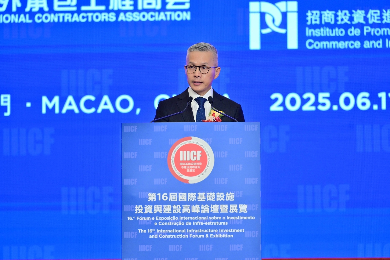 • Secretary for Economy and Finance of the Macao SAR Government Tai Kin Ip delivers a speech at the opening ceremony of the 16th International Infrastructure Investment and Construction Forum & Exhibition