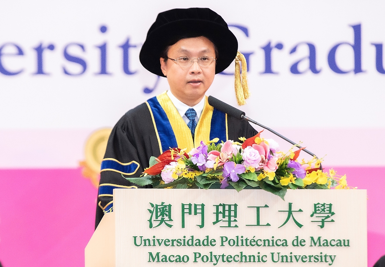 Graduate representative, Lei Benedict Valentine Sheryl, from the Bachelor’s Degree Programme in Sino-Lusophone Trade Relations, delivered a speech expressing gratitude to the Macao SAR Government for its long-term substantial investment in higher education, to MPU for its interdisciplinary approach to talent cultivation and the dedicated guidance of its faculty, and to his family for their unwavering support. He concluded by offering blessings in Portuguese to all graduates and shared the saying, “Steel is forged through relentless hammering; talent is shaped through trials and challenges,” as mutual encouragement.