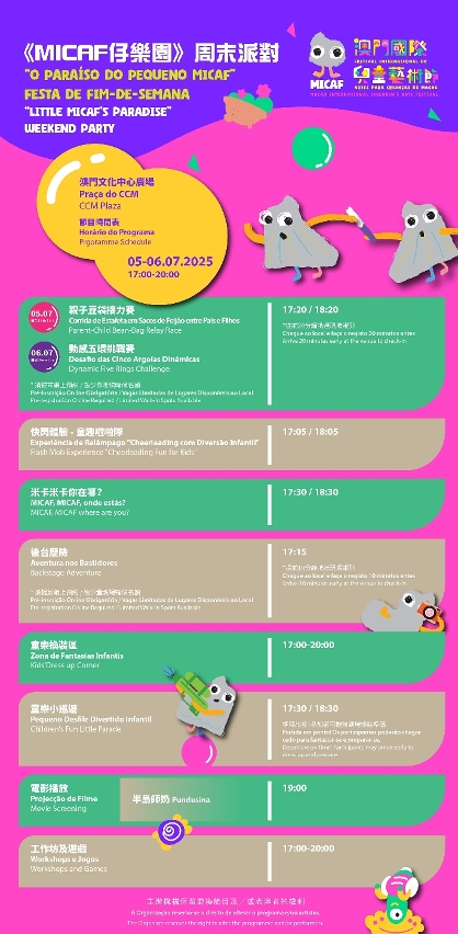 From 5 July to 17 August, every Saturday and Sunday, the weekend parties of “Little MICAF’s Paradise”, co-organised by the Cultural Affairs Bureau and Sands China Ltd., will be held at the CCM Plaza. The square will be transformed into a family playground featuring a number of competitive games and large inflatable installations incorporating sports elements, in echo of the competitive spirit of the 15th National Games. Activities on site will include pop-up interactive experiences, outdoor film screenings, as well as arts and crafts workshops. The weekend party competitions of “Little MICAF’s Paradise”, “Parent-Child Bean-Bag Relay Race” and “Dynamic Five Rings Challenge” are suitable for children aged 3 to 10 and their parents. Registration will open from 12pm on 3 July through the official MICAF website. A limited number of walk-in quotas is available on a first-come, first-served basis. Winners will also receive prizes. For more details, please visit the website www.icm.gov.mo/micaf.
