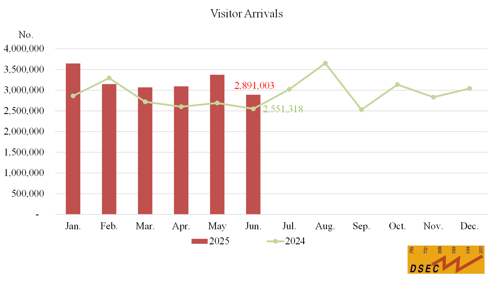 In June 2025, number of visitor arrivals rose by 13.3% year-on-year to 2,891,003; same-day visitors (1,611,641) and overnight visitors (1,279,362) grew by 22.5% and 3.6% respectively. Meanwhile, the average length of stay of visitors remained at 1.2 days year-on-year. The duration of stay for same-day visitors (0.2 day) remained unchanged while overnight visitors (2.4 days) increased by 0.1 day year-on-year.