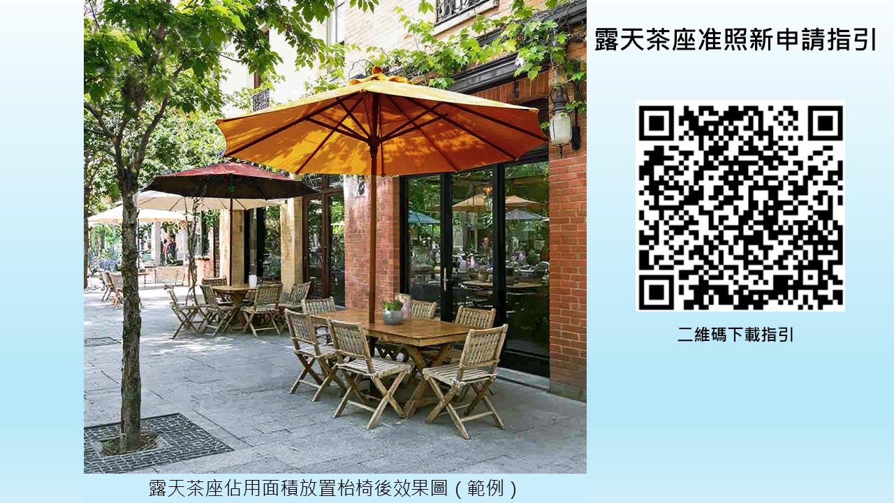 The guidelines on new applications for the License for Outdoor Cafes can be downloaded by going to the following link of IAM’s website (https://www.iam.gov.mo/adminAttachment.ashx?p=1,316).
