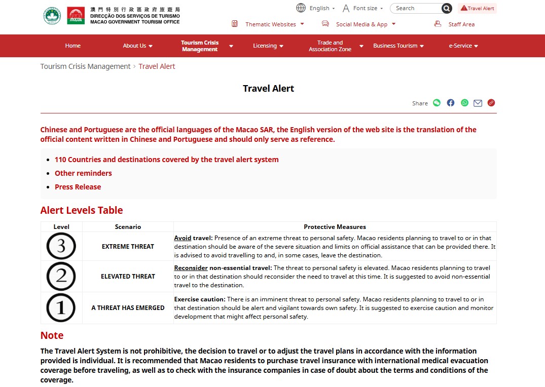 At present, the classification comprises three levels of travel alerts as issued by the Macao SAR Travel Alert System. For the list of 110 countries and travel destinations currently covered by the Macao SAR Travel Alert System, and more information about the classification of travel alerts, please visit the webpage: https://www.dst.gov.mo/en/tourism-crisis-management/tourism-crisis-management-travel-alert.html.