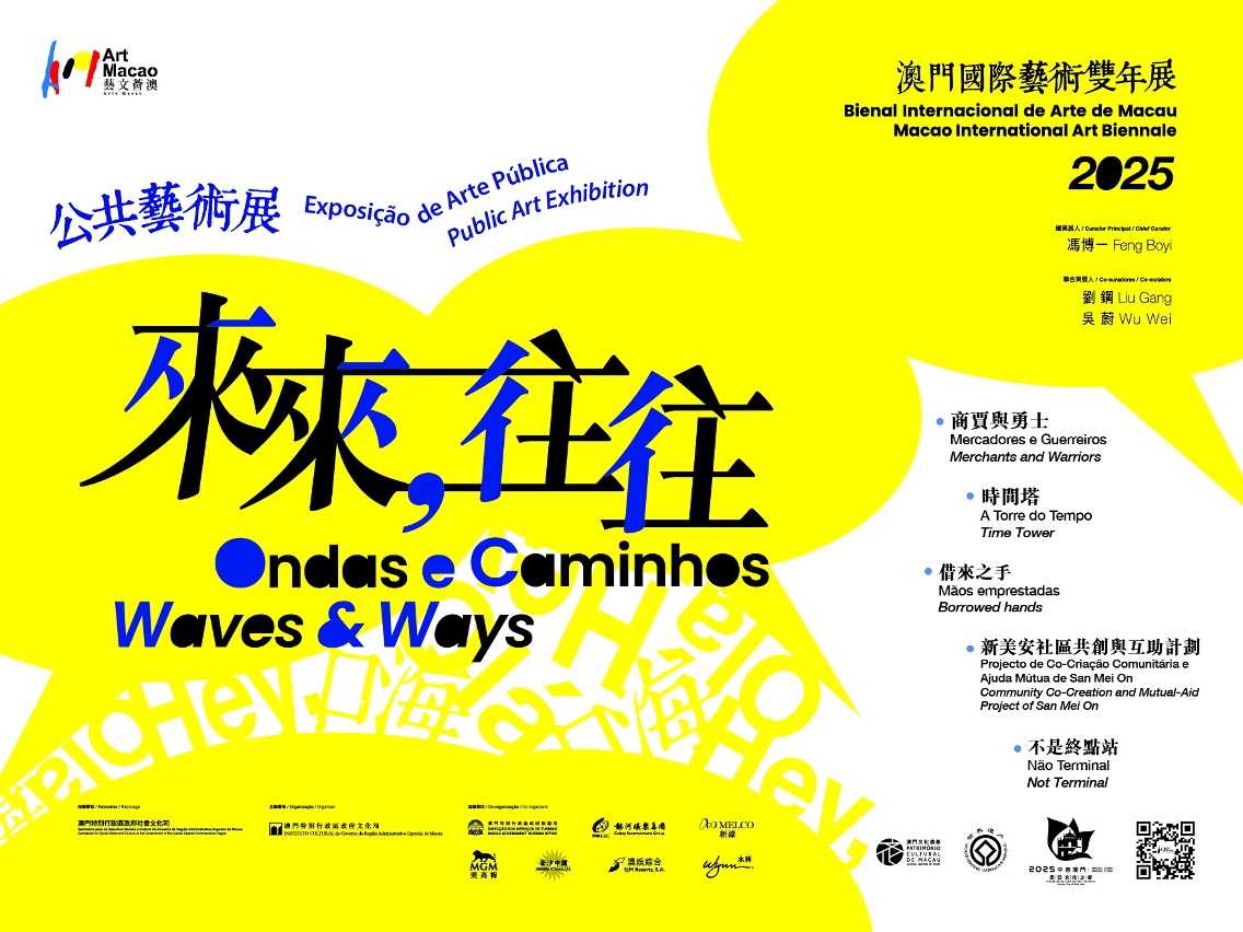 With Feng Boyi serving as the chief curator, and Liu Gang and Wu Wei as the co-curators, the public art exhibition, themed “Waves & Ways”, integrates art into urban spaces and daily lives, inviting visitors to imagine new possibilities for public spaces as they walk and pause to contemplate. It also echoes the theme of this Biennale “Hey, what brings you here?”, inviting visitors to weave the emotional fabric of the city together. The public art exhibition integrates 5 pieces/sets of artworks by 9 renowned artists from home and abroad into the urban dynamics, including the Community Co-Creation and Mutual-Aid Project of San Mei On first run in July and August; the artwork Time Tower created to commemorate Macao’s designation as a “Culture City of East Asia 2025”; and the artworks Borrowed Hands, Merchants and Warriors and Not Terminal, which are scheduled to be unveiled simultaneously on the opening day.