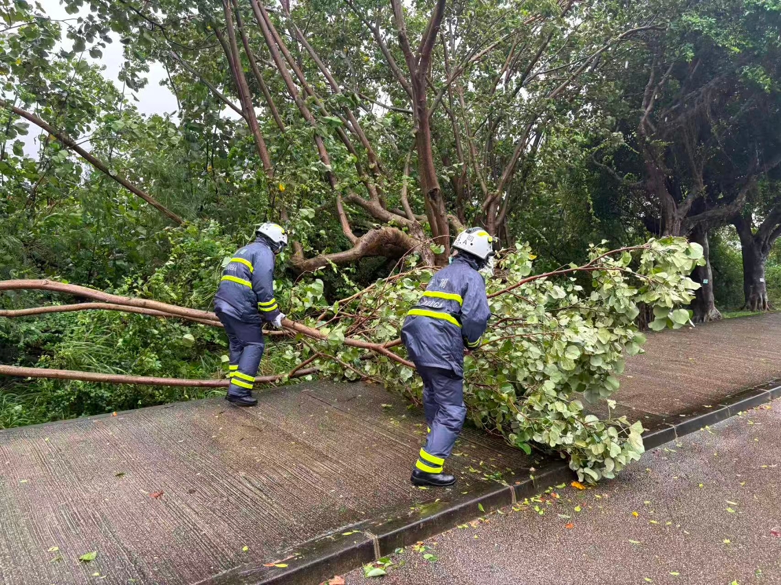 As “Tapah” was gradually moving away from Macao, the Meteorological and Geophysical Bureau issued a Blue Storm Surge Warning at 11:00 a.m. on 8 September, and the 9 public car parks in the low-lying areas were also gradually reopened. Furthermore, the Security Forces and Services quickly formed clearance teams, operating under safety permits. Personnel were dispatched to various districts in Macao to remove collapsed trees and clear road obstructions, ensuring the smooth flow of major roads and swiftly restoring social order to normality. These efforts were undertaken to ensure the safety of both citizens and tourists during their travels. With the impact of “Tapah” diminishing, Typhoon Signal No. 3 was issued by the Meteorological and Geophysical Bureau at 3:00 p.m. It was assessed that the overall situation in the city was normal, and following the Chief Executive Dispatch, the immediate prevention stage was terminated as of 3:00 p.m. on 8 September. The four cross-sea bridges were reopened at 3:00 p.m., while the lower deck the Sai Van Bridge was closed after all vehicles had departed.