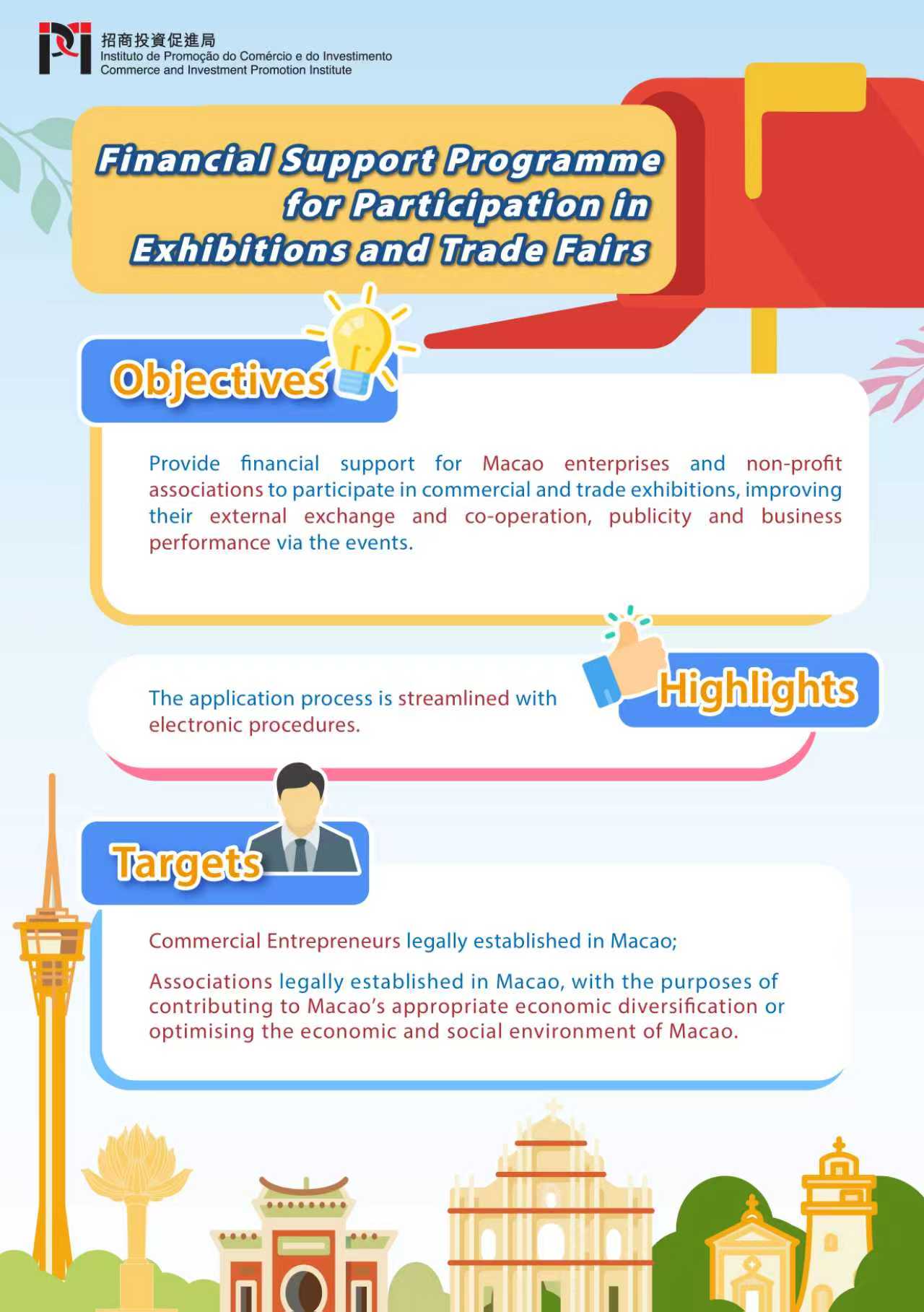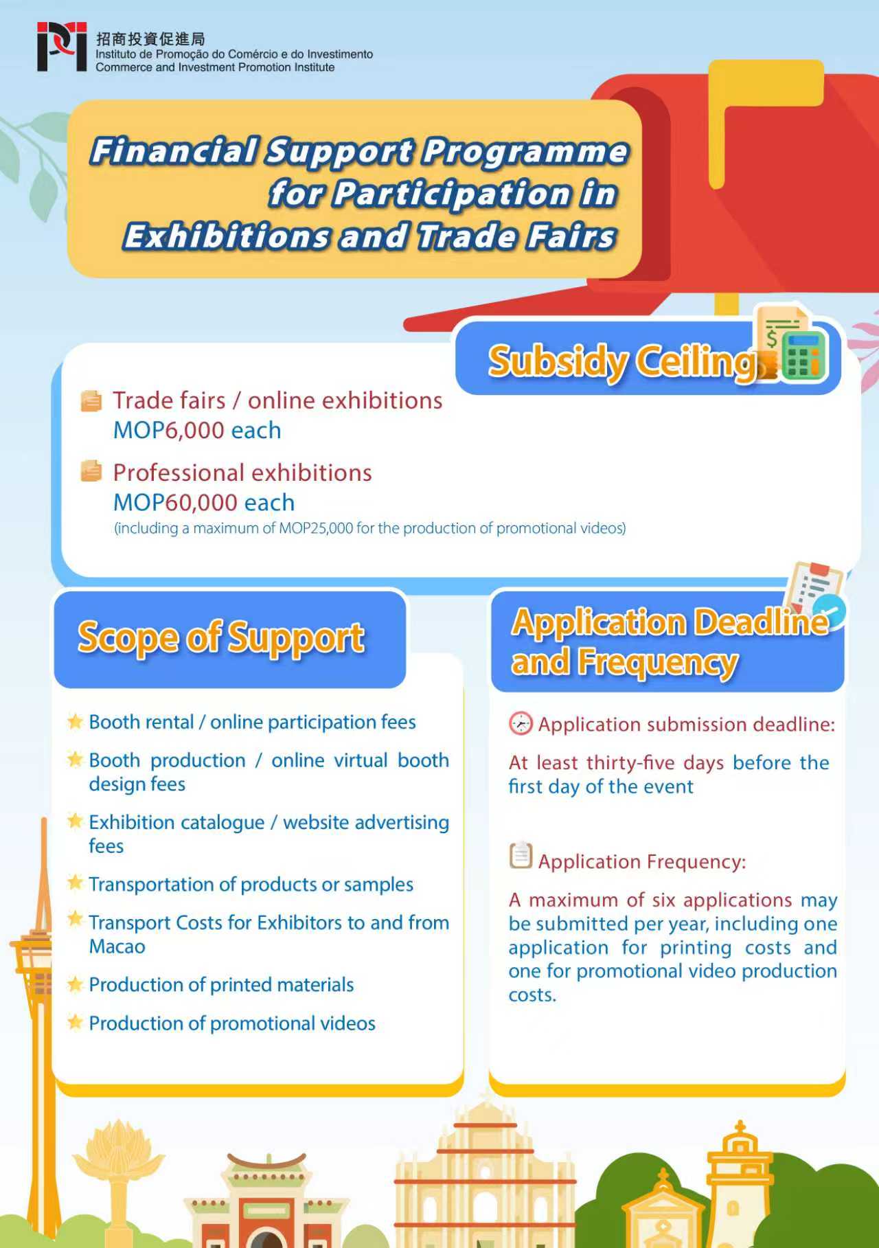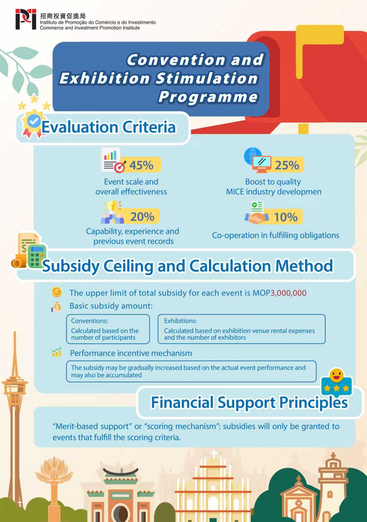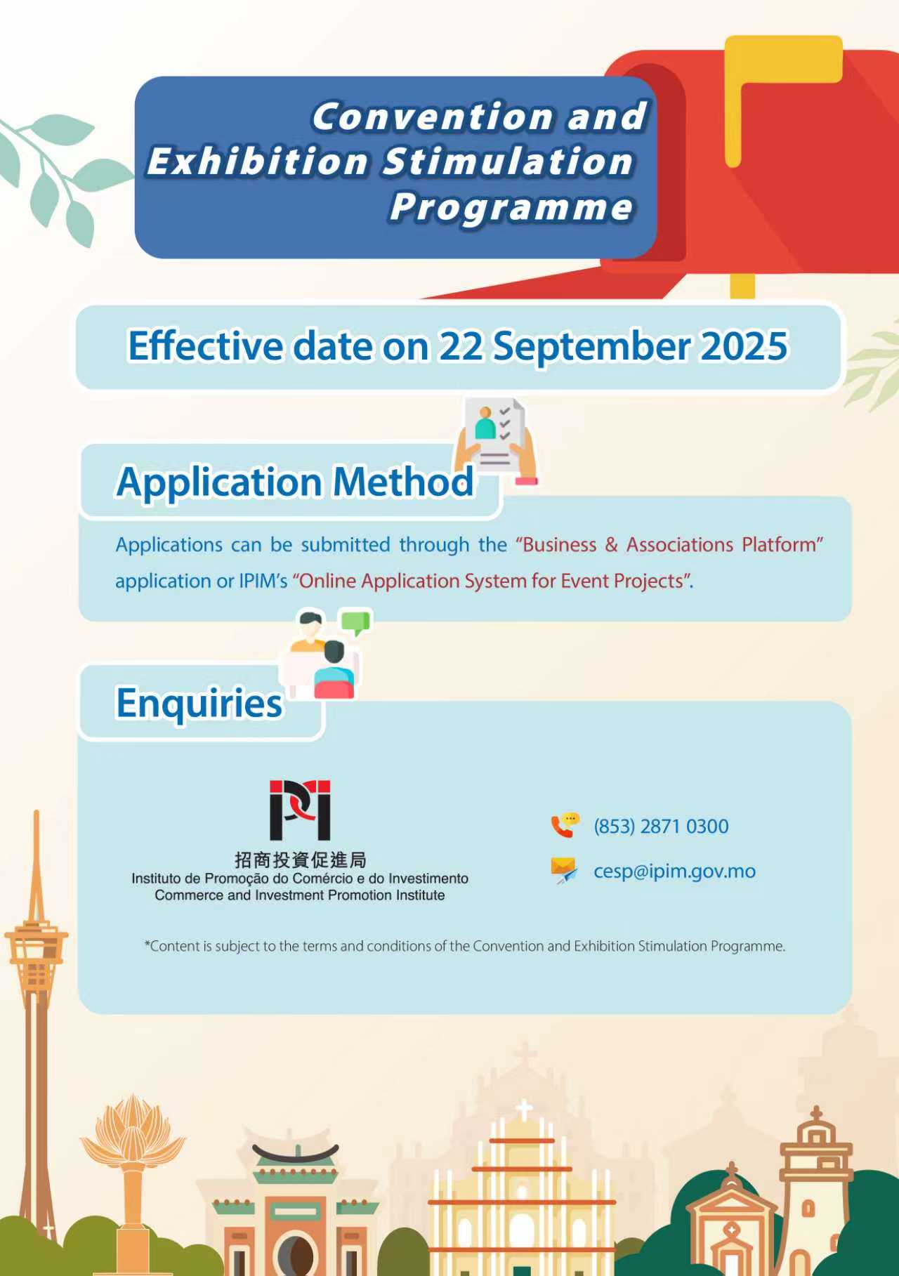 To further enhance the international competitiveness and development vitality of Macao’s MICE industry, and to promote the internationalisation, professionalisation, digitalisation and green development of local MICE events, the Commerce and Investment Promotion Institute (IPIM) has revised the “Convention and Exhibition Stimulation Programme” and the “Financial Support Programme for Participation in Exhibitions and Trade Fairs” and held a briefing session on 18 September 2025 on the optimised content.