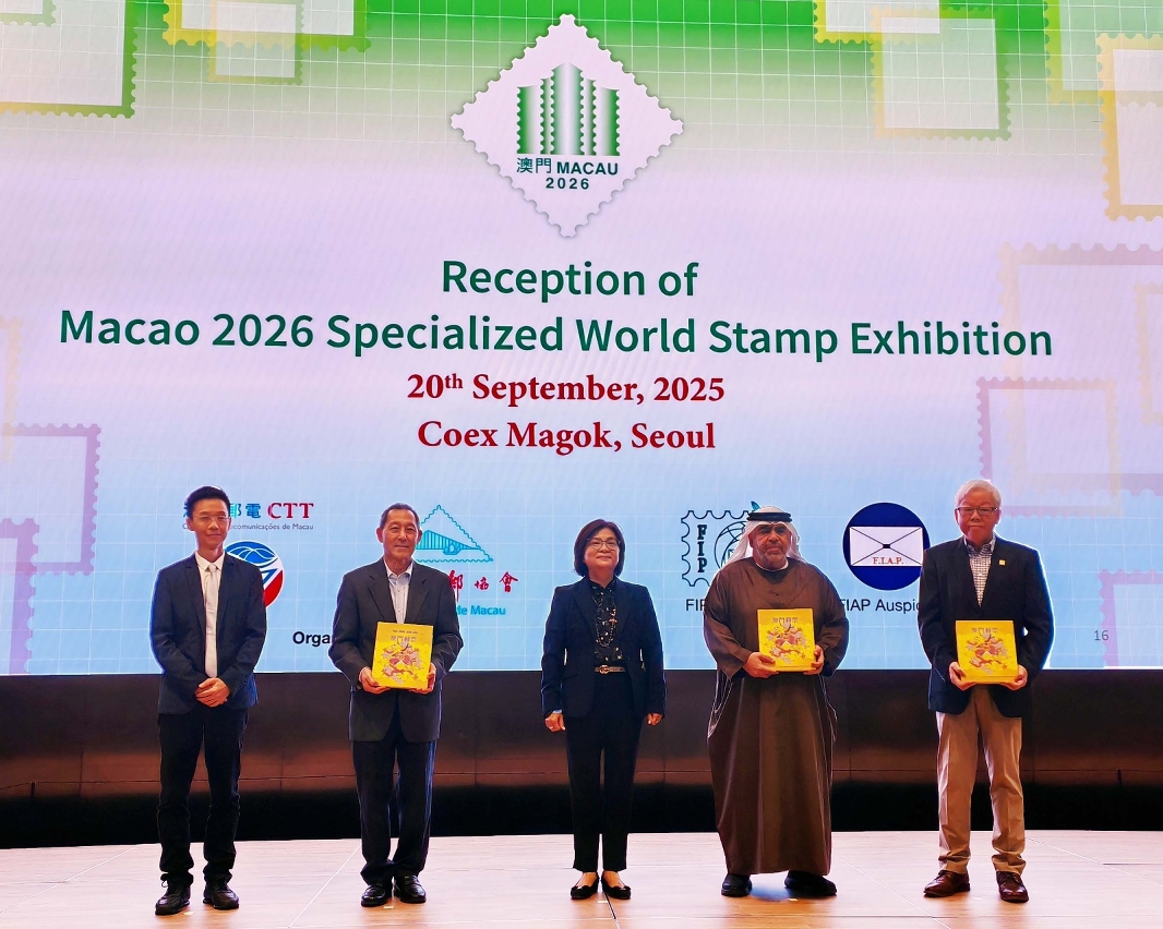 To further promote the upcoming “Macao 2026 Specialized World Stamp Exhibition” (MACAO 2026), representatives from the Macao Post and Telecommunications Bureau (CTT) attended the Philakorea 2025 World Stamp Exhibition, taking place in Seoul, Korea, from September 17 to 21. On the sidelines of the event, CTT held a reception dedicated to MACAO 2026 on September 20. At this reception, Director Lau Wai Meng presented the ongoing preparations and the highlights of the forthcoming exhibition to a group of guests, which included representatives of the Fédération Internationale de Philatélie (FIP), the Federation of Inter-Asian Philately (FIAP), the Postal Administrations, and several philatelic societies and associations, as well as philatelic dealers, exhibitors, jurors, and commissioners. The presentation showcased the enthusiasm and distinctive character of Macao’s cultural heritage.