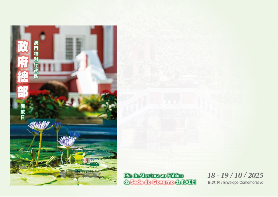 To celebrate the Open Day of Government Headquarters of the MSAR, Macao Post and Telecommunications Bureau announces that a Temporary Post Counter will be set up at Avenida Panorâmica do Lago Nam Van, from 09:00 to 18:00 on 18th and 19th October 2025, to provide the commemorative postmark cancellation service for the “Open Day of Government Headquarters of the MSAR”.